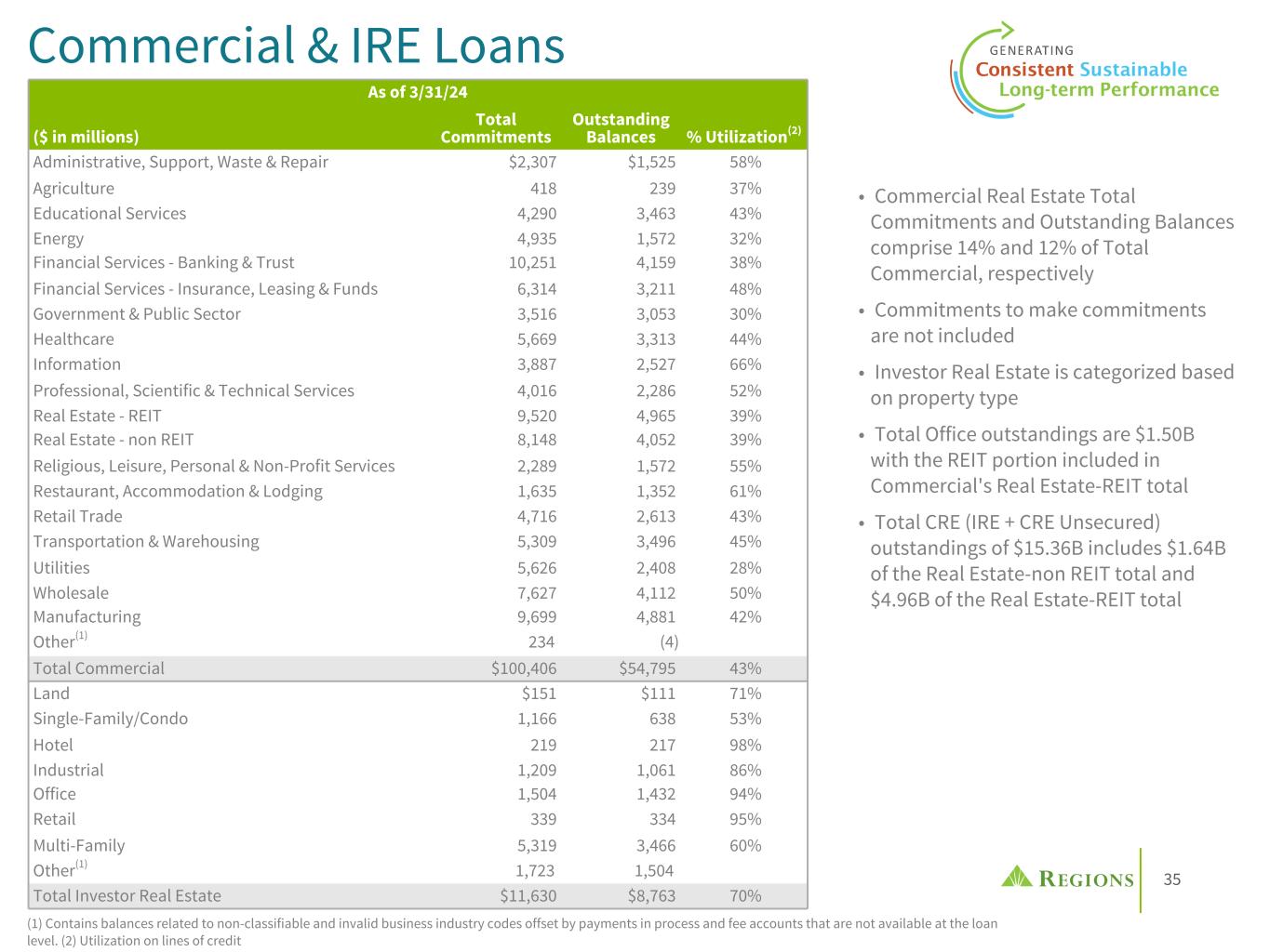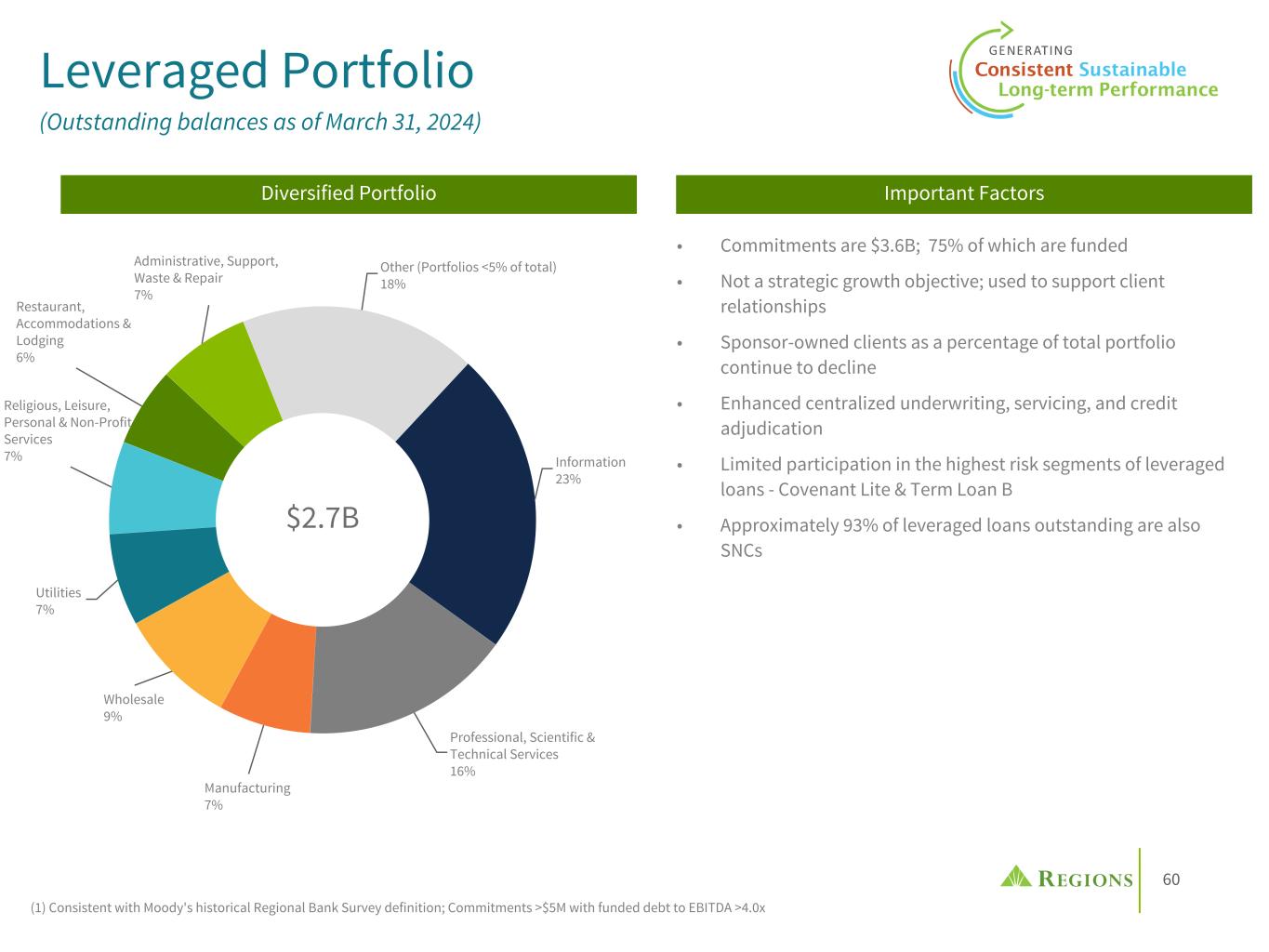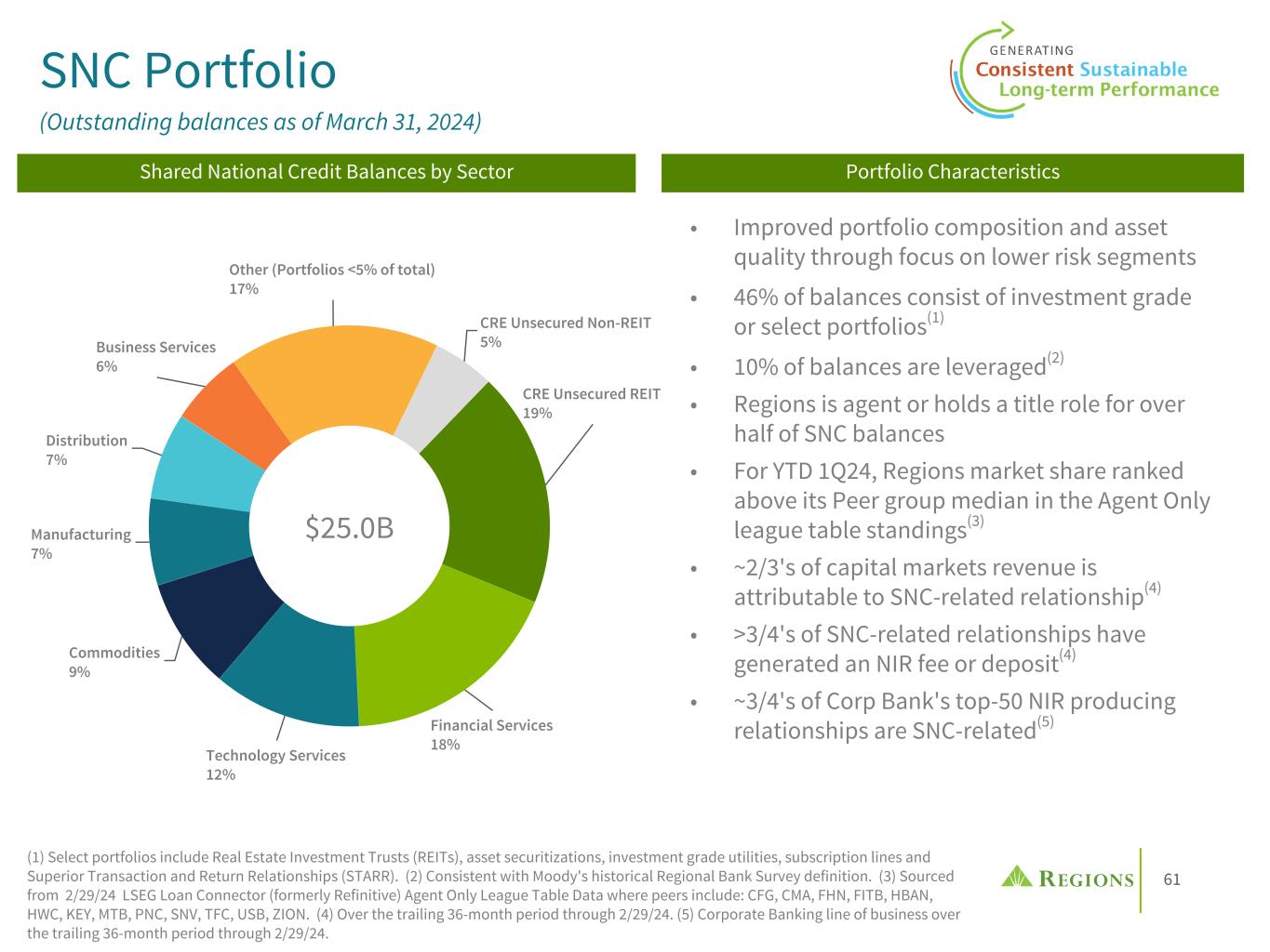 60 $2.7B Leveraged Portfolio (Outstanding balances as of March 31, 2024) • Commitments are $3.6B; 75% of which are funded • Not a strategic growth objective; used to support client relationships • Sponsor-owned clients as a percentage of total portfolio continue to decline • Enhanced centralized underwriting, servicing, and credit adjudication • Limited participation in the highest risk segments of leveraged loans - Covenant Lite & Term Loan B • Approximately 93% of leveraged loans outstanding are also SNCs Important FactorsDiversified Portfolio Information 23% Professional, Scientific & Technical Services 16% Manufacturing 7% Wholesale 9% Utilities 7% Religious, Leisure, Personal & Non-Profit Services 7% Restaurant, Accommodations & Lodging 6% Administrative, Support, Waste & Repair 7% Other (Portfolios <5% of total) 18% (1) Consistent with Moody's historical Regional Bank Survey definition; Commitments >$5M with funded debt to EBITDA >4.0x