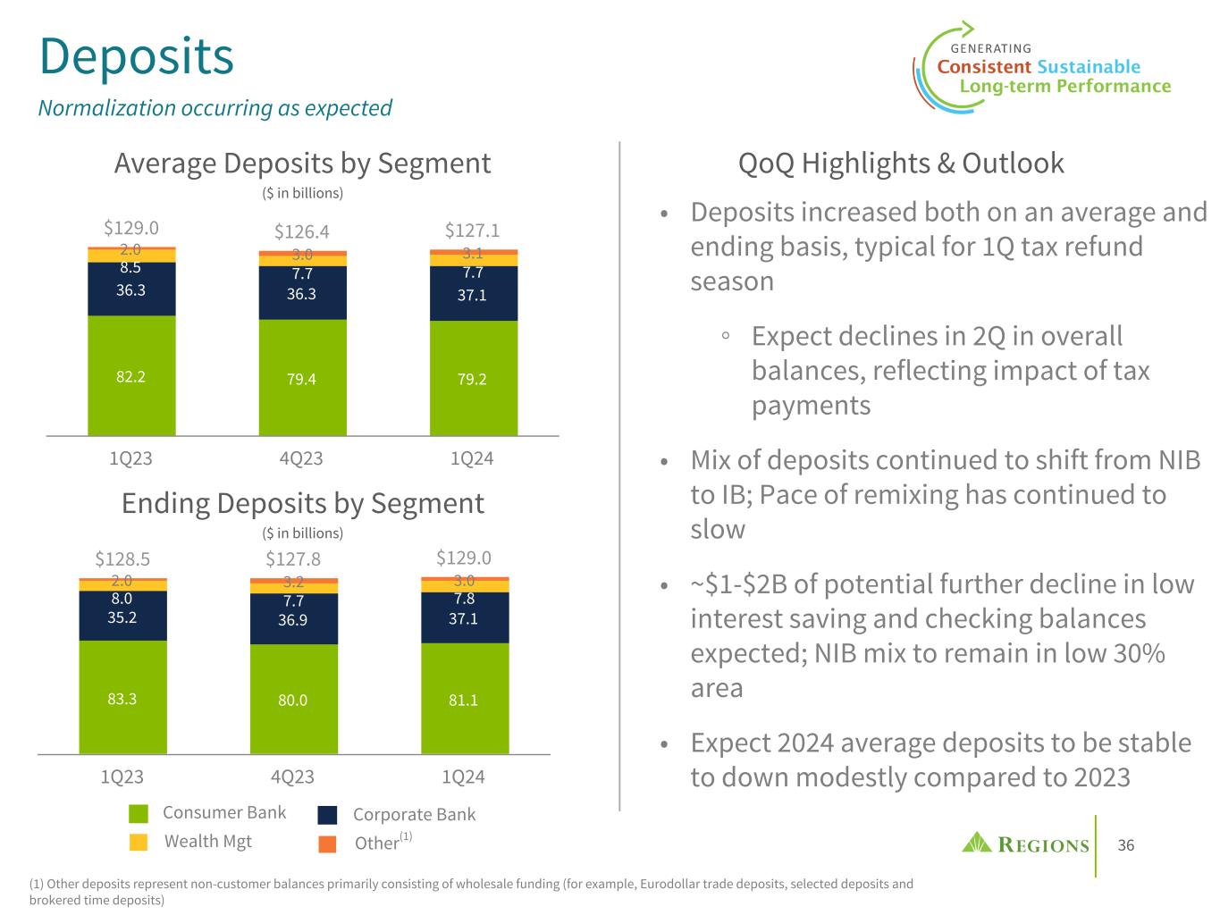 36 $128.5 $127.8 $129.0 83.3 80.0 81.1 35.2 36.9 37.1 8.0 7.7 7.8 2.0 3.2 3.0 1Q23 4Q23 1Q24 $129.0 $126.4 $127.1 82.2 79.4 79.2 36.3 36.3 37.1 8.5 7.7 7.7 2.0 3.0 3.1 1Q23 4Q23 1Q24 Deposits Normalization occurring as expected (1) Other deposits represent non-customer balances primarily consisting of wholesale funding (for example, Eurodollar trade deposits, selected deposits and brokered time deposits) Wealth Mgt Other(1) Consumer Bank Corporate Bank • Deposits increased both on an average and ending basis, typical for 1Q tax refund season ◦ Expect declines in 2Q in overall balances, reflecting impact of tax payments • Mix of deposits continued to shift from NIB to IB; Pace of remixing has continued to slow • ~$1-$2B of potential further decline in low interest saving and checking balances expected; NIB mix to remain in low 30% area • Expect 2024 average deposits to be stable to down modestly compared to 2023 QoQ Highlights & OutlookAverage Deposits by Segment ($ in billions) Ending Deposits by Segment ($ in billions)