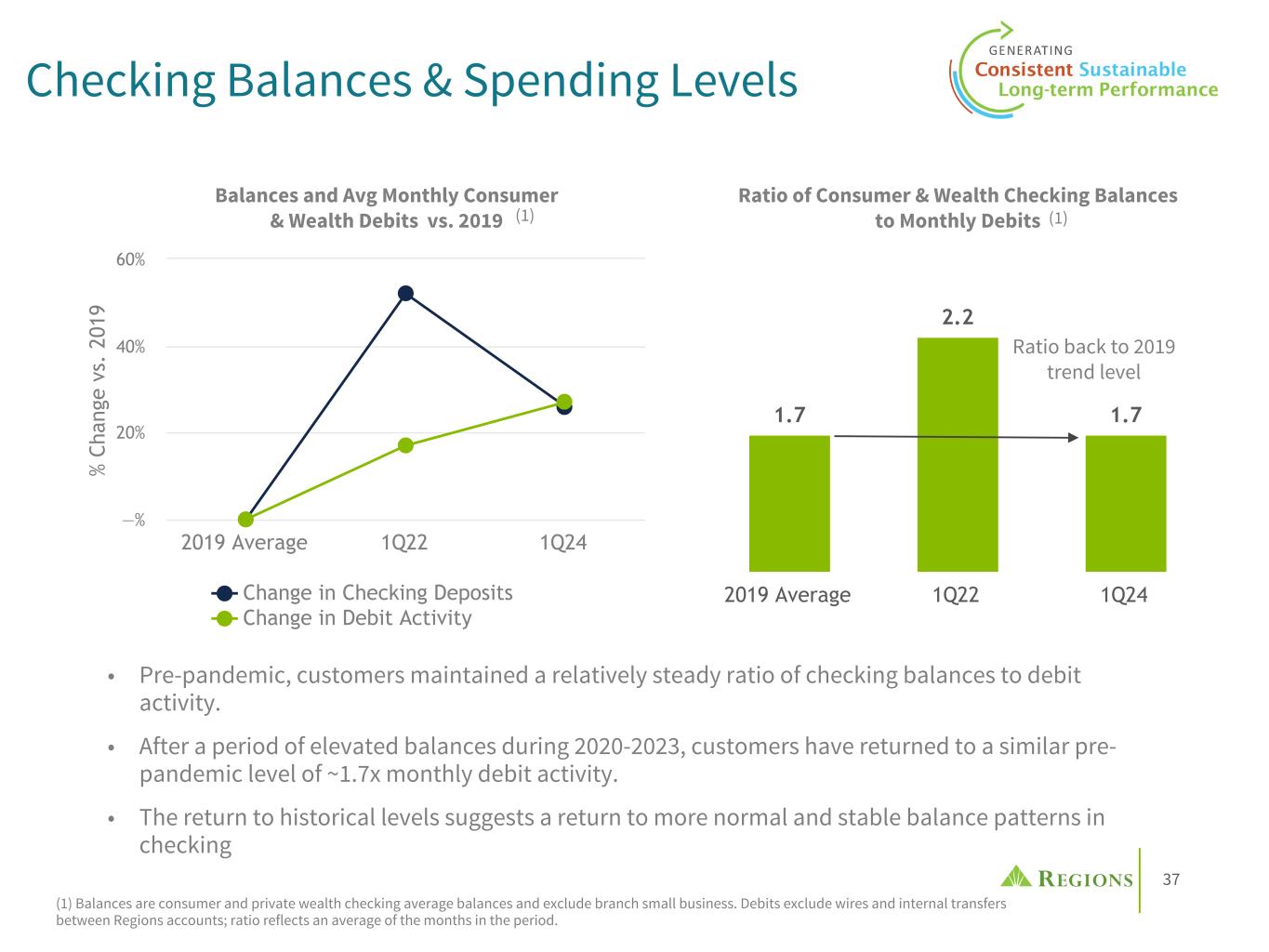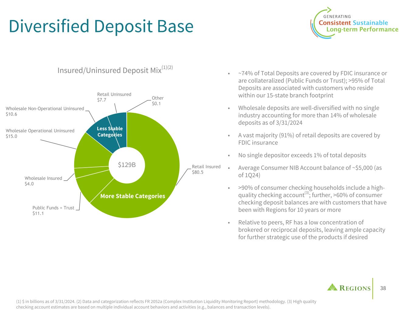 37 Checking Balances & Spending Levels % Ch an ge v s. 2 01 9 Change in Checking Deposits Change in Debit Activity 2019 Average 1Q22 1Q24 —% 20% 40% 60% Balances and Avg Monthly Consumer & Wealth Debits vs. 2019 • Pre-pandemic, customers maintained a relatively steady ratio of checking balances to debit activity. • After a period of elevated balances during 2020-2023, customers have returned to a similar pre- pandemic level of ~1.7x monthly debit activity. • The return to historical levels suggests a return to more normal and stable balance patterns in checking 1.7 2.2 1.7 2019 Average 1Q22 1Q24 Ratio of Consumer & Wealth Checking Balances to Monthly Debits (1) Ratio back to 2019 trend level (1) (1) Balances are consumer and private wealth checking average balances and exclude branch small business. Debits exclude wires and internal transfers between Regions accounts; ratio reflects an average of the months in the period.