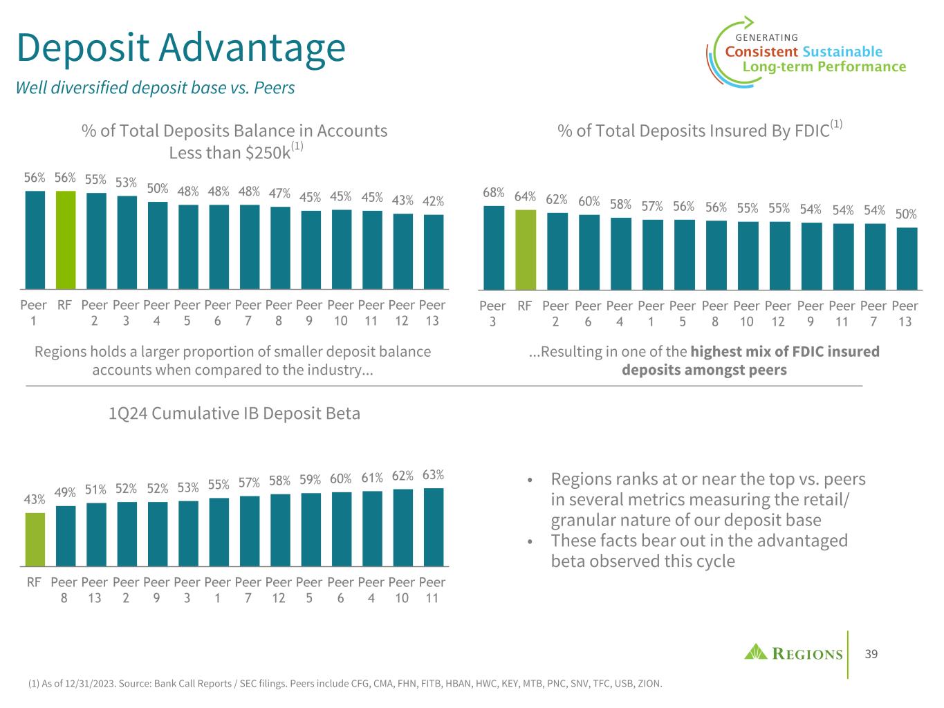 38 Diversified Deposit Base (1) $ in billions as of 3/31/2024. (2) Data and categorization reflects FR 2052a (Complex Institution Liquidity Monitoring Report) methodology. (3) High quality checking account estimates are based on multiple individual account behaviors and activities (e.g., balances and transaction levels). Insured/Uninsured Deposit Mix(1)(2) • ~74% of Total Deposits are covered by FDIC insurance or are collateralized (Public Funds or Trust); >95% of Total Deposits are associated with customers who reside within our 15-state branch footprint • Wholesale deposits are well-diversified with no single industry accounting for more than 14% of wholesale deposits as of 3/31/2024 • A vast majority (91%) of retail deposits are covered by FDIC insurance • No single depositor exceeds 1% of total deposits • Average Consumer NIB Account balance of ~$5,000 (as of 1Q24) • >90% of consumer checking households include a high- quality checking account(3); further, >60% of consumer checking deposit balances are with customers that have been with Regions for 10 years or more • Relative to peers, RF has a low concentration of brokered or reciprocal deposits, leaving ample capacity for further strategic use of the products if desired Retail Insured $80.5 Public Funds + Trust $11.1 Wholesale Insured $4.0 Wholesale Operational Uninsured $15.0 Wholesale Non-Operational Uninsured $10.6 Retail Uninsured $7.7 Other $0.1 Less Stable Categories More Stable Categories $129B