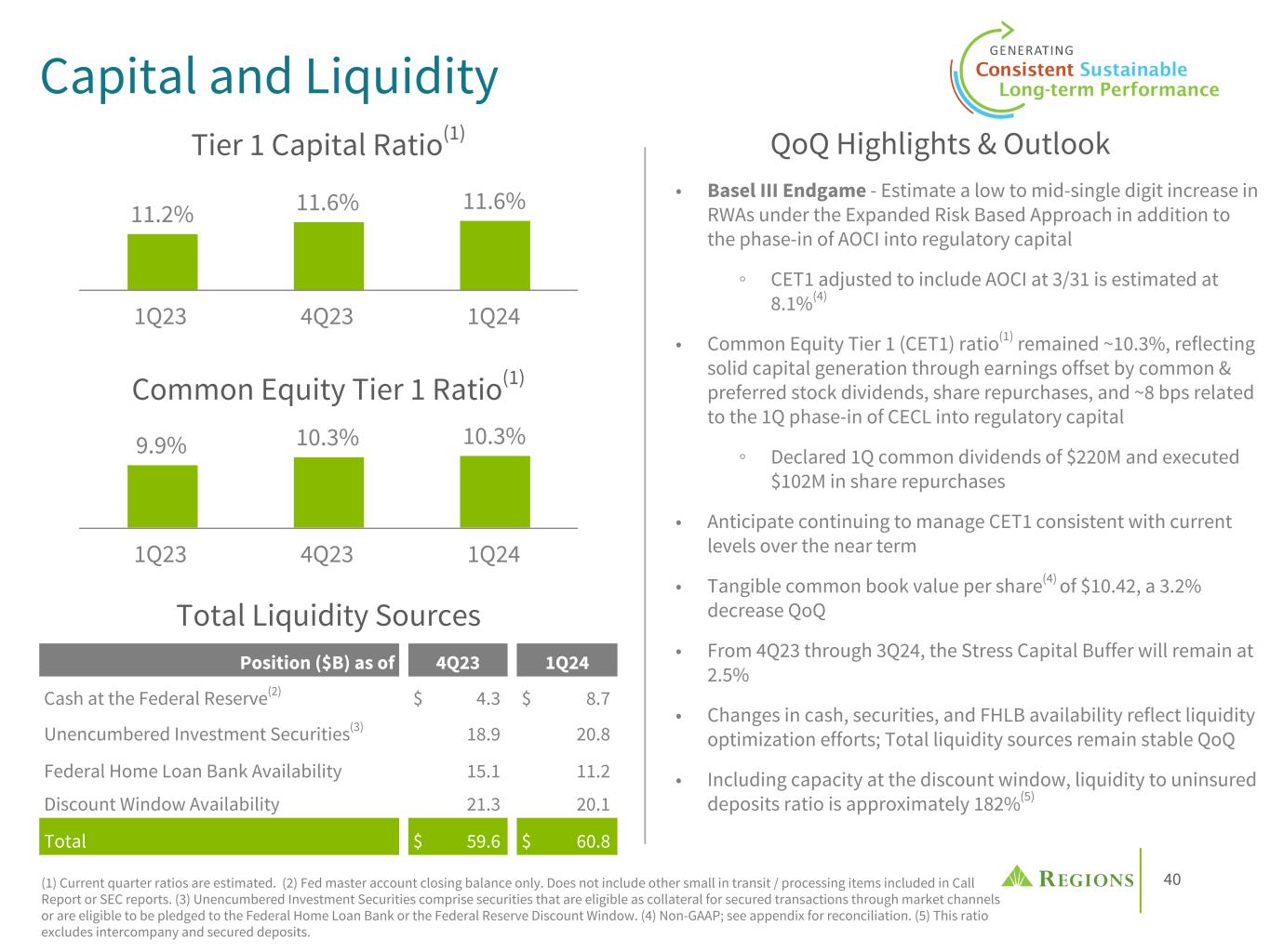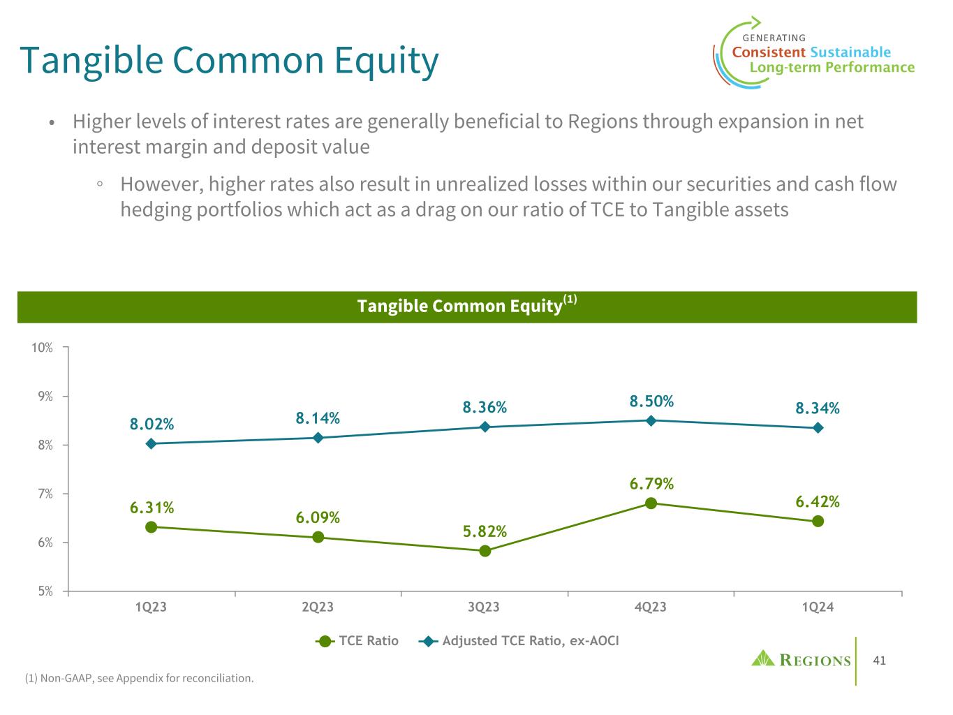 40 • Basel III Endgame - Estimate a low to mid-single digit increase in RWAs under the Expanded Risk Based Approach in addition to the phase-in of AOCI into regulatory capital ◦ CET1 adjusted to include AOCI at 3/31 is estimated at 8.1%(4) • Common Equity Tier 1 (CET1) ratio(1) remained ~10.3%, reflecting solid capital generation through earnings offset by common & preferred stock dividends, share repurchases, and ~8 bps related to the 1Q phase-in of CECL into regulatory capital ◦ Declared 1Q common dividends of $220M and executed $102M in share repurchases • Anticipate continuing to manage CET1 consistent with current levels over the near term • Tangible common book value per share(4) of $10.42, a 3.2% decrease QoQ • From 4Q23 through 3Q24, the Stress Capital Buffer will remain at 2.5% • Changes in cash, securities, and FHLB availability reflect liquidity optimization efforts; Total liquidity sources remain stable QoQ • Including capacity at the discount window, liquidity to uninsured deposits ratio is approximately 182%(5) 9.9% 10.3% 10.3% 1Q23 4Q23 1Q24 QoQ Highlights & Outlook Capital and Liquidity 11.2% 11.6% 11.6% 1Q23 4Q23 1Q24 Tier 1 Capital Ratio(1) Common Equity Tier 1 Ratio(1) Position ($B) as of 4Q23 1Q24 Cash at the Federal Reserve(2) $ 4.3 $ 8.7 Unencumbered Investment Securities(3) 18.9 20.8 Federal Home Loan Bank Availability 15.1 11.2 Discount Window Availability 21.3 20.1 Total $ 59.6 $ 60.8 (1) Current quarter ratios are estimated. (2) Fed master account closing balance only. Does not include other small in transit / processing items included in Call Report or SEC reports. (3) Unencumbered Investment Securities comprise securities that are eligible as collateral for secured transactions through market channels or are eligible to be pledged to the Federal Home Loan Bank or the Federal Reserve Discount Window. (4) Non-GAAP; see appendix for reconciliation. (5) This ratio excludes intercompany and secured deposits. Total Liquidity Sources