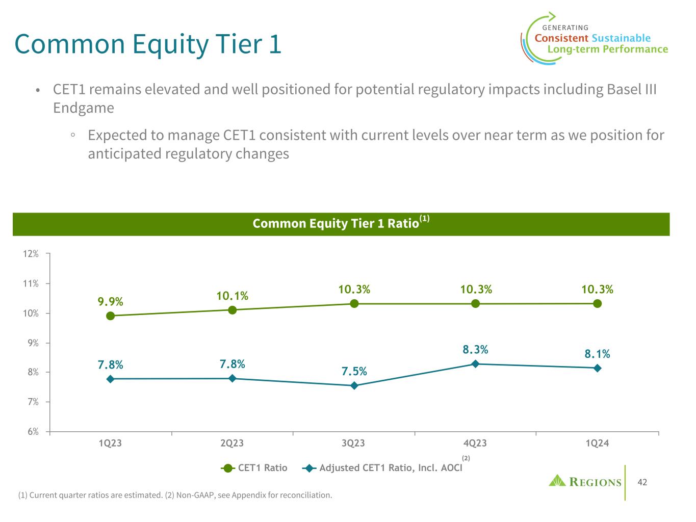 41 6.31% 6.09% 5.82% 6.79% 6.42% 8.02% 8.14% 8.36% 8.50% 8.34% TCE Ratio Adjusted TCE Ratio, ex-AOCI 1Q23 2Q23 3Q23 4Q23 1Q24 5% 6% 7% 8% 9% 10% Tangible Common Equity (1) Non-GAAP, see Appendix for reconciliation. • Higher levels of interest rates are generally beneficial to Regions through expansion in net interest margin and deposit value ◦ However, higher rates also result in unrealized losses within our securities and cash flow hedging portfolios which act as a drag on our ratio of TCE to Tangible assets Tangible Common Equity(1)