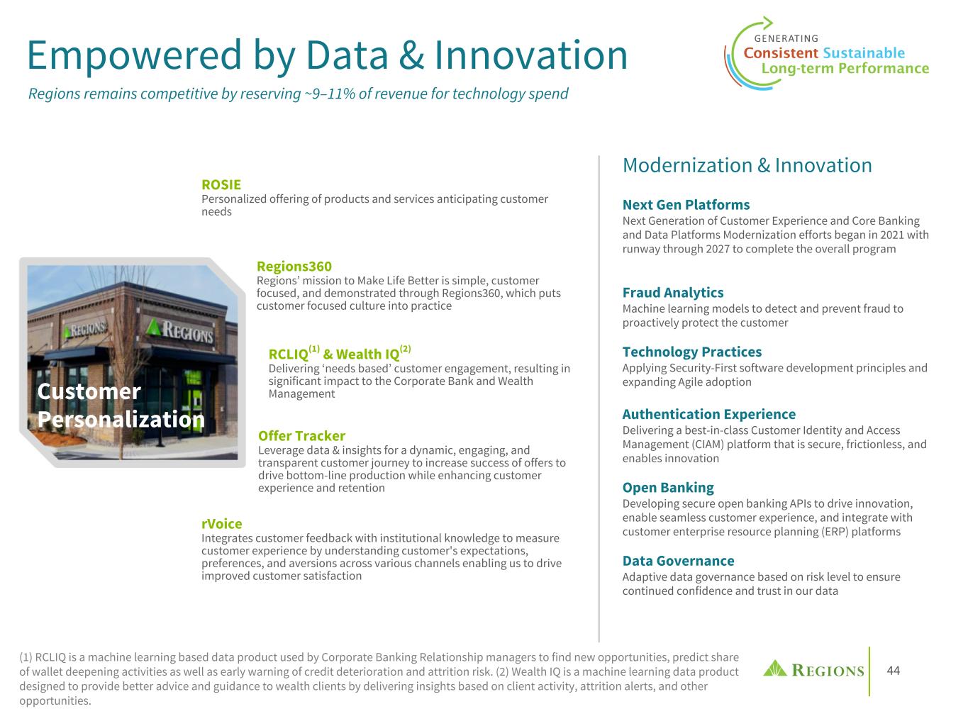 44 Empowered by Data & Innovation Regions remains competitive by reserving ~9–11% of revenue for technology spend Next Gen Platforms Next Generation of Customer Experience and Core Banking and Data Platforms Modernization efforts began in 2021 with runway through 2027 to complete the overall program Fraud Analytics Machine learning models to detect and prevent fraud to proactively protect the customer Technology Practices Applying Security-First software development principles and expanding Agile adoption Authentication Experience Delivering a best-in-class Customer Identity and Access Management (CIAM) platform that is secure, frictionless, and enables innovation Open Banking Developing secure open banking APIs to drive innovation, enable seamless customer experience, and integrate with customer enterprise resource planning (ERP) platforms Data Governance Adaptive data governance based on risk level to ensure continued confidence and trust in our data Modernization & Innovation ROSIE Personalized offering of products and services anticipating customer needs Regions360 Regions’ mission to Make Life Better is simple, customer focused, and demonstrated through Regions360, which puts customer focused culture into practice RCLIQ(1) & Wealth IQ(2) Delivering ‘needs based’ customer engagement, resulting in significant impact to the Corporate Bank and Wealth Management Offer Tracker Leverage data & insights for a dynamic, engaging, and transparent customer journey to increase success of offers to drive bottom-line production while enhancing customer experience and retention rVoice Integrates customer feedback with institutional knowledge to measure customer experience by understanding customer's expectations, preferences, and aversions across various channels enabling us to drive improved customer satisfaction Customer Personalization (1) RCLIQ is a machine learning based data product used by Corporate Banking Relationship managers to find new opportunities, predict share of wallet deepening activities as well as early warning of credit deterioration and attrition risk. (2) Wealth IQ is a machine learning data product designed to provide better advice and guidance to wealth clients by delivering insights based on client activity, attrition alerts, and other opportunities.