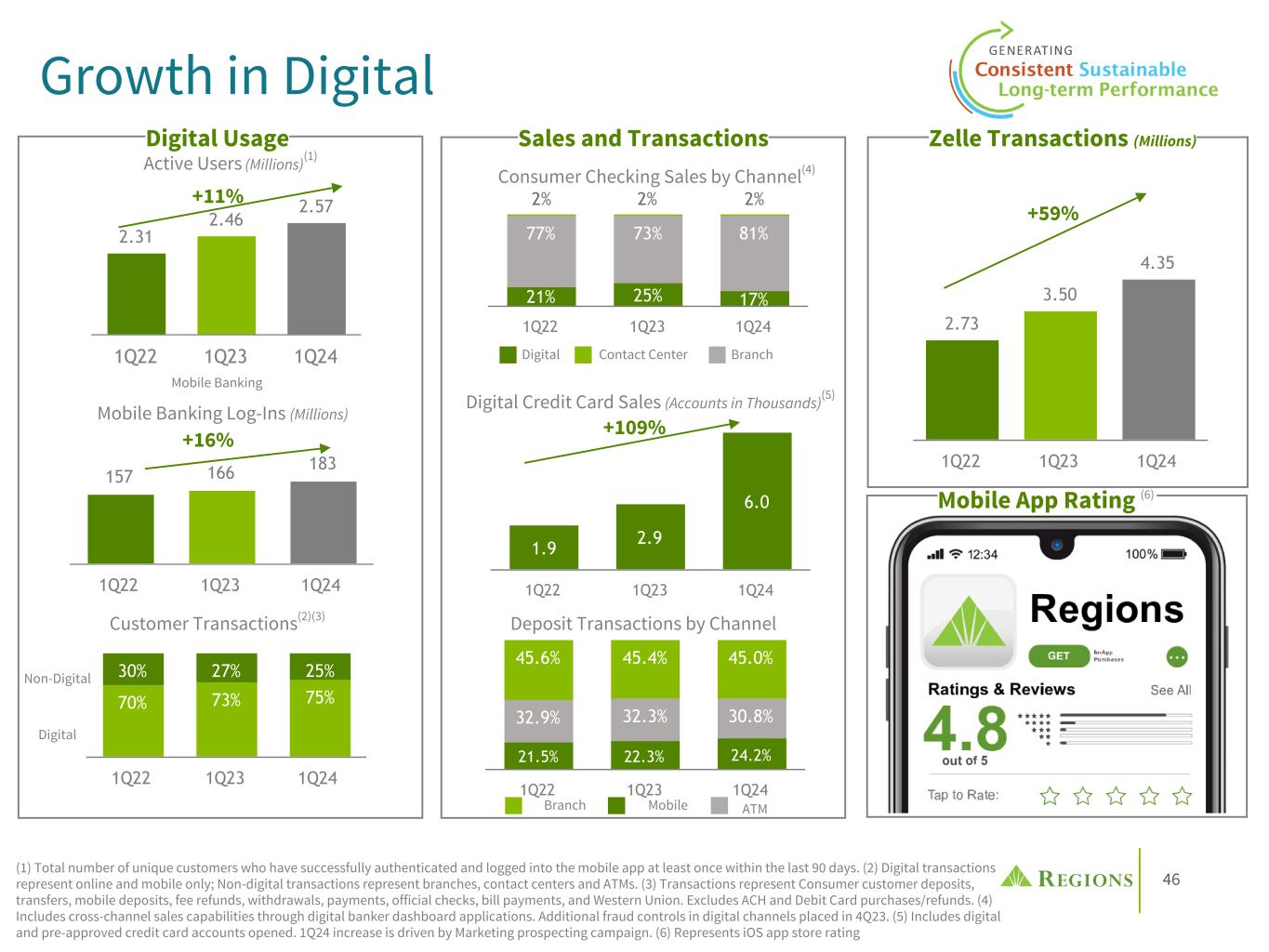 46 2.31 2.46 2.57 1Q22 1Q23 1Q24 2.73 3.50 4.35 1Q22 1Q23 1Q24 157 166 183 1Q22 1Q23 1Q24 21.5% 22.3% 24.2% 32.9% 32.3% 30.8% 45.6% 45.4% 45.0% 1Q22 1Q23 1Q24 1.9 2.9 6.0 1Q22 1Q23 1Q24 70% 73% 75% 30% 27% 25% 1Q22 1Q23 1Q24 Growth in Digital Mobile Banking Log-Ins (Millions) Customer Transactions(2)(3) Deposit Transactions by Channel Active Users (Millions)(1) Digital Credit Card Sales (Accounts in Thousands)(5) Digital Non-Digital Mobile ATMBranch +59% +16% 21% 25% 17% 77% 73% 81% 2% 2% 2% 1Q22 1Q23 1Q24 Digital BranchContact Center Consumer Checking Sales by Channel(4) Mobile Banking Mobile App Rating (6) Zelle Transactions (Millions)Sales and TransactionsDigital Usage +11% (1) Total number of unique customers who have successfully authenticated and logged into the mobile app at least once within the last 90 days. (2) Digital transactions represent online and mobile only; Non-digital transactions represent branches, contact centers and ATMs. (3) Transactions represent Consumer customer deposits, transfers, mobile deposits, fee refunds, withdrawals, payments, official checks, bill payments, and Western Union. Excludes ACH and Debit Card purchases/refunds. (4) Includes cross-channel sales capabilities through digital banker dashboard applications. Additional fraud controls in digital channels placed in 4Q23. (5) Includes digital and pre-approved credit card accounts opened. 1Q24 increase is driven by Marketing prospecting campaign. (6) Represents iOS app store rating +109%