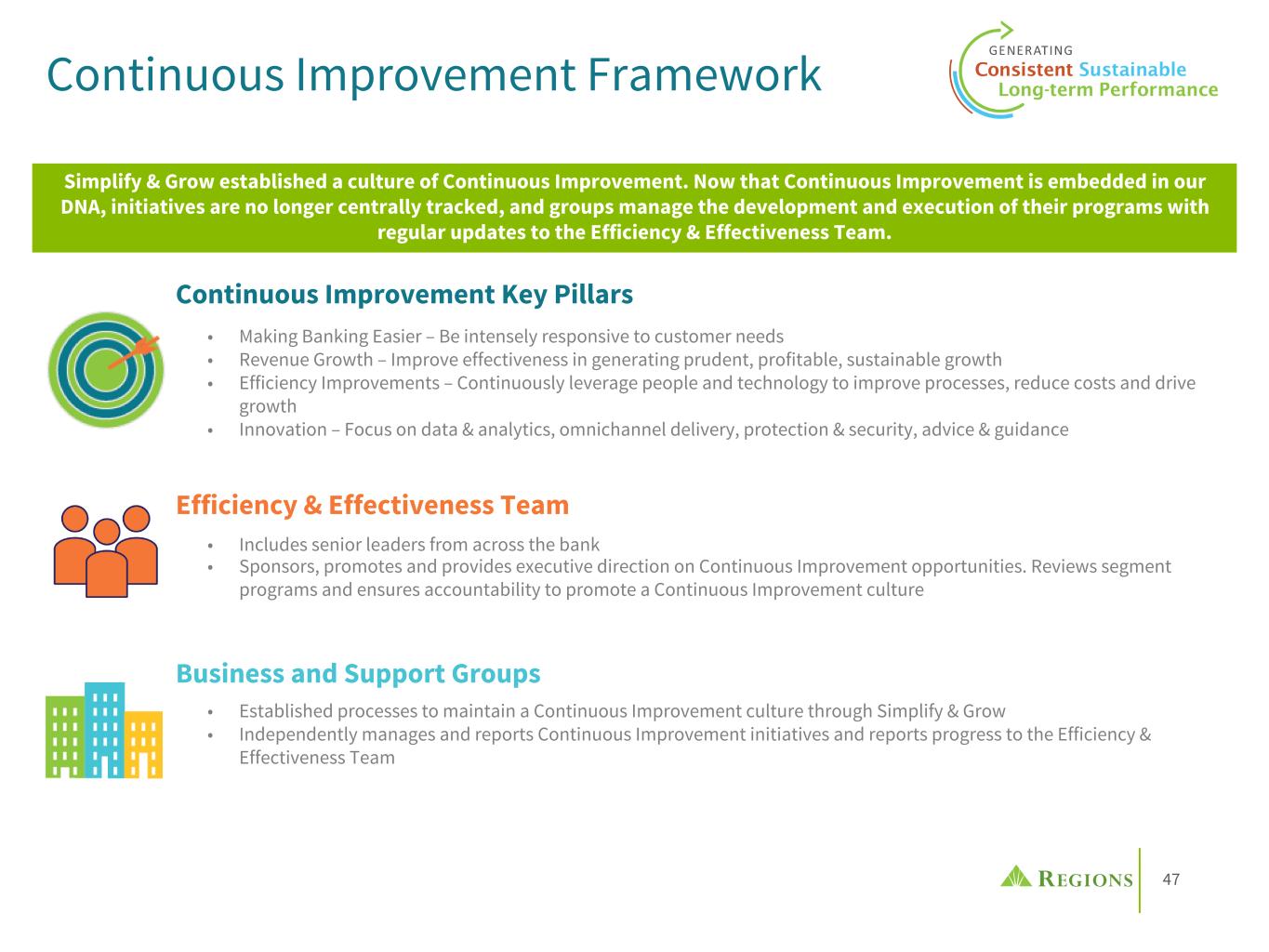 47 Continuous Improvement Framework • Making Banking Easier – Be intensely responsive to customer needs • Revenue Growth – Improve effectiveness in generating prudent, profitable, sustainable growth • Efficiency Improvements – Continuously leverage people and technology to improve processes, reduce costs and drive growth • Innovation – Focus on data & analytics, omnichannel delivery, protection & security, advice & guidance Simplify & Grow established a culture of Continuous Improvement. Now that Continuous Improvement is embedded in our DNA, initiatives are no longer centrally tracked, and groups manage the development and execution of their programs with regular updates to the Efficiency & Effectiveness Team. • Established processes to maintain a Continuous Improvement culture through Simplify & Grow • Independently manages and reports Continuous Improvement initiatives and reports progress to the Efficiency & Effectiveness Team • Includes senior leaders from across the bank • Sponsors, promotes and provides executive direction on Continuous Improvement opportunities. Reviews segment programs and ensures accountability to promote a Continuous Improvement culture Continuous Improvement Key Pillars Efficiency & Effectiveness Team Business and Support Groups