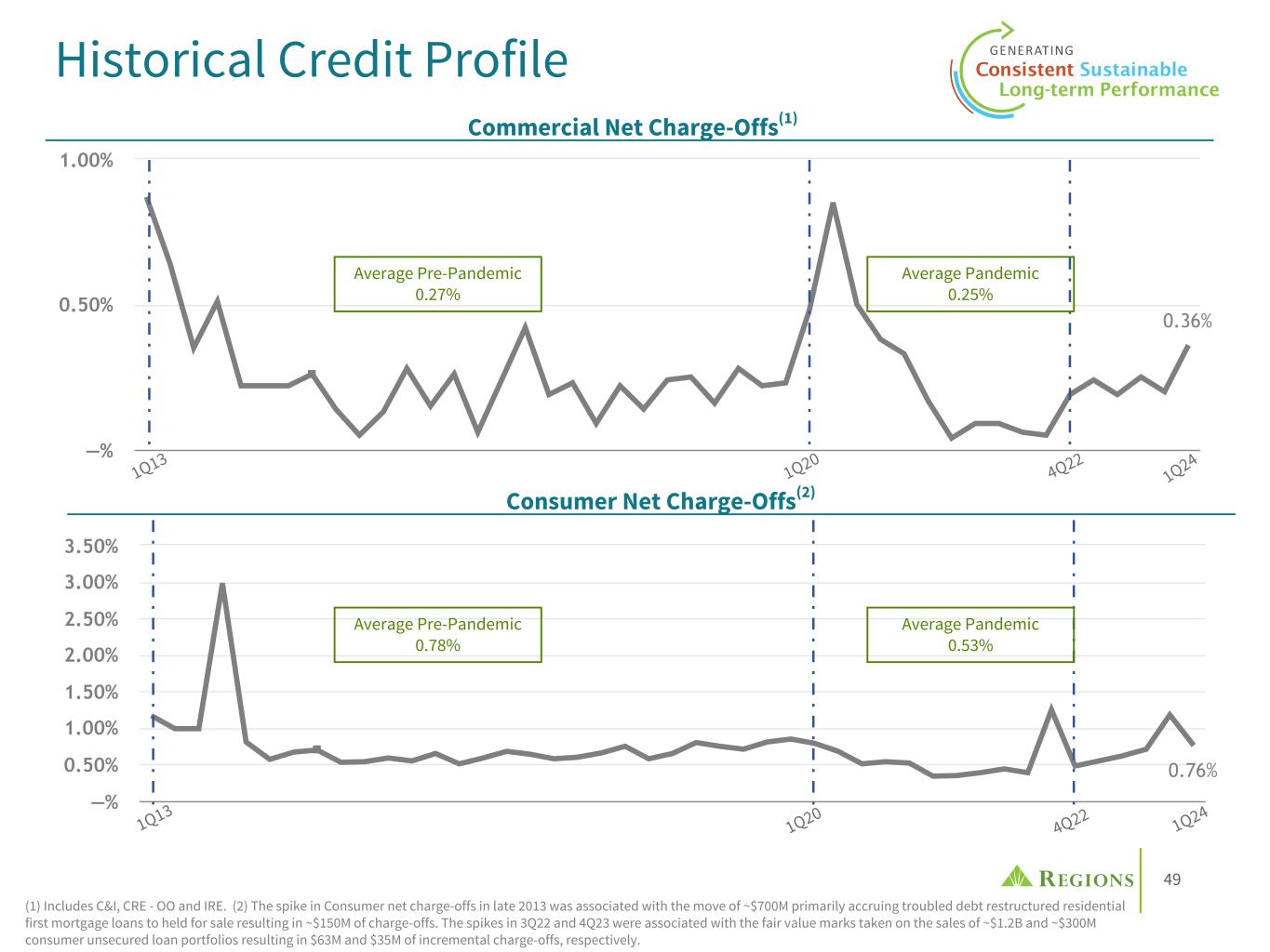 49 0.76% —% 0.50% 1.00% 1.50% 2.00% 2.50% 3.00% 3.50% 0.36% —% 0.50% 1.00% Historical Credit Profile Consumer Net Charge-Offs(2) Commercial Net Charge-Offs(1) 1Q20 1Q24 4Q22 1Q20 4Q22 1Q24 (1) Includes C&I, CRE - OO and IRE. (2) The spike in Consumer net charge-offs in late 2013 was associated with the move of ~$700M primarily accruing troubled debt restructured residential first mortgage loans to held for sale resulting in ~$150M of charge-offs. The spikes in 3Q22 and 4Q23 were associated with the fair value marks taken on the sales of ~$1.2B and ~$300M consumer unsecured loan portfolios resulting in $63M and $35M of incremental charge-offs, respectively. Average Pre-Pandemic 0.27% Average Pandemic 0.25% Average Pre-Pandemic 0.78% Average Pandemic 0.53% 1Q13 1Q13