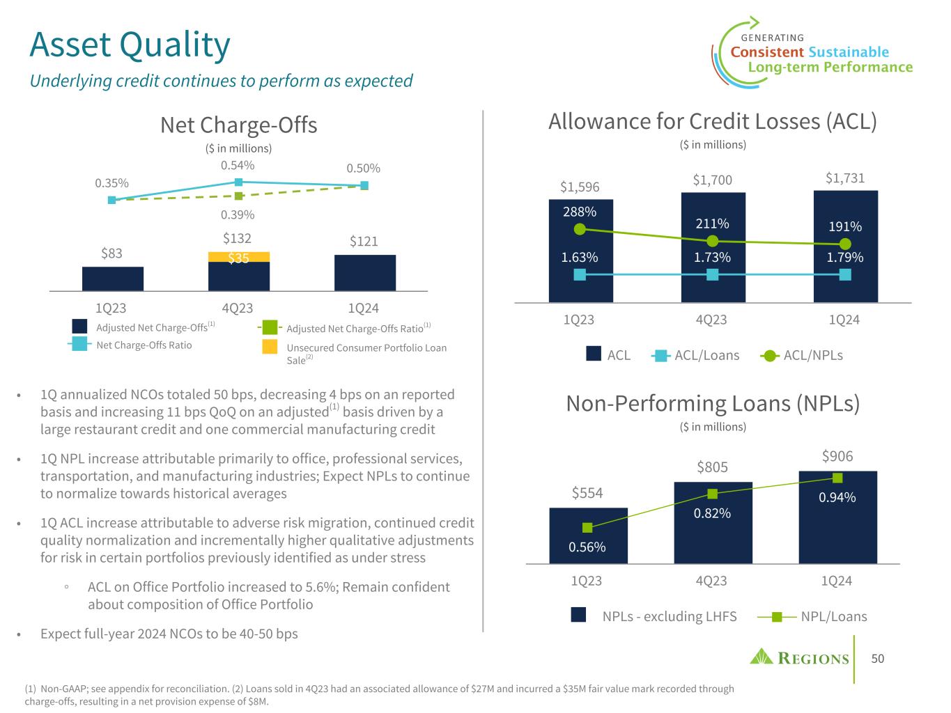 50 • 1Q annualized NCOs totaled 50 bps, decreasing 4 bps on an reported basis and increasing 11 bps QoQ on an adjusted(1) basis driven by a large restaurant credit and one commercial manufacturing credit • 1Q NPL increase attributable primarily to office, professional services, transportation, and manufacturing industries; Expect NPLs to continue to normalize towards historical averages • 1Q ACL increase attributable to adverse risk migration, continued credit quality normalization and incrementally higher qualitative adjustments for risk in certain portfolios previously identified as under stress ◦ ACL on Office Portfolio increased to 5.6%; Remain confident about composition of Office Portfolio • Expect full-year 2024 NCOs to be 40-50 bps Asset Quality Underlying credit continues to perform as expected $1,596 $1,700 $1,731 1.63% 1.73% 1.79% 288% 211% 191% ACL ACL/Loans ACL/NPLs 1Q23 4Q23 1Q24 $83 $132 $121 $35 1Q23 4Q23 1Q24 0.39% 0.35% 0.54% 0.50% $554 $805 $906 0.56% 0.82% 0.94% NPLs - excluding LHFS NPL/Loans 1Q23 4Q23 1Q24 Adjusted Net Charge-Offs(1) Unsecured Consumer Portfolio Loan Sale(2) Net Charge-Offs Ratio Adjusted Net Charge-Offs Ratio(1) (1) Non-GAAP; see appendix for reconciliation. (2) Loans sold in 4Q23 had an associated allowance of $27M and incurred a $35M fair value mark recorded through charge-offs, resulting in a net provision expense of $8M. Net Charge-Offs ($ in millions) Allowance for Credit Losses (ACL) ($ in millions) Non-Performing Loans (NPLs) ($ in millions)