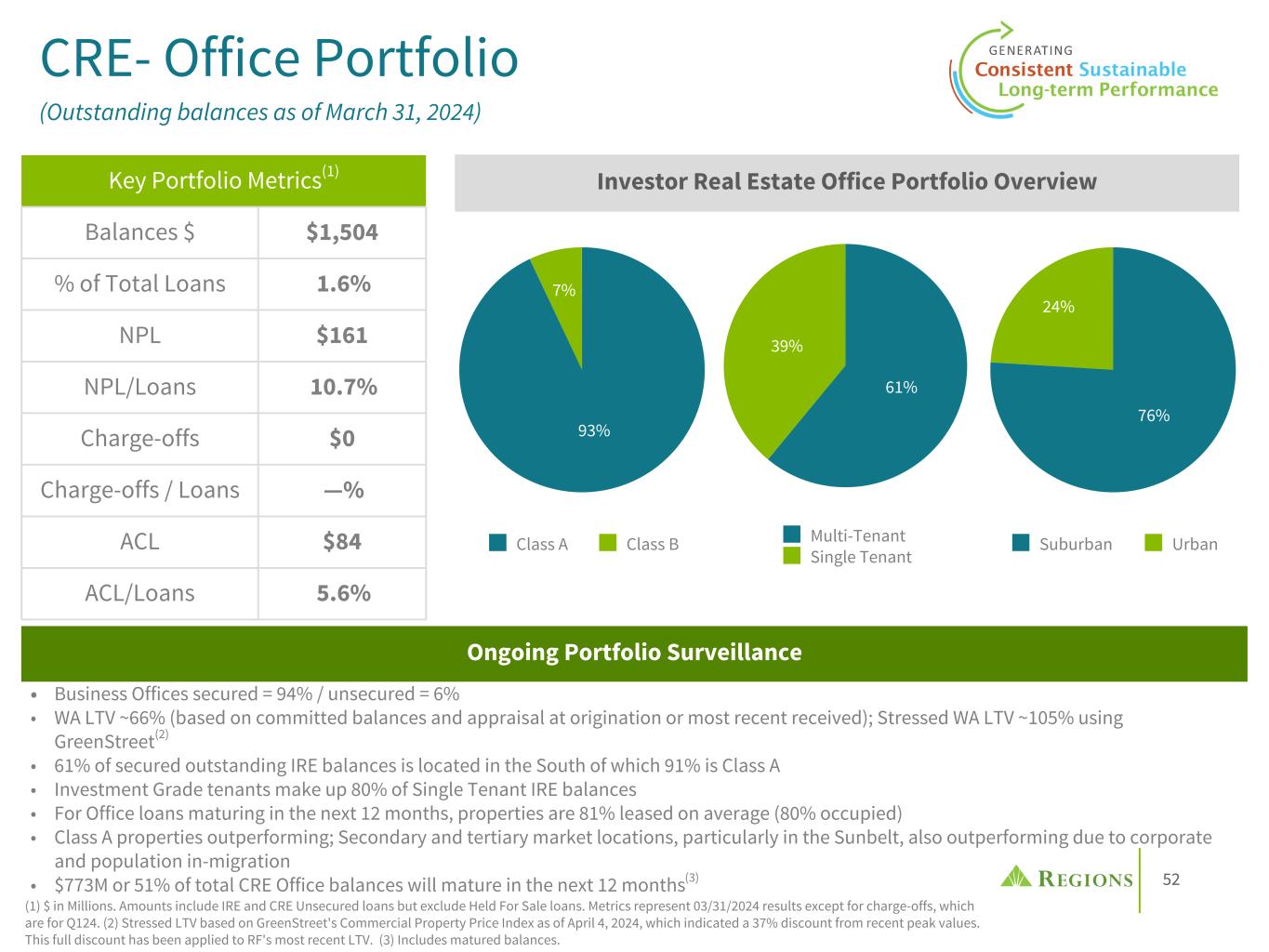 51 Commercial Real Estate (Outstanding balances as of March 31, 2024) Highly Diversified Portfolio (IRE including Unsecured CRE) • Unsecured loans for RE purposes generally have low leverage, with strong access to liquidity ◦ 62% of REIT outstanding balances are investment grade or mapped to an IG risk rating, which provides loss insulation to the overall portfolio ◦ Balance of remaining unsecured is primarily to institutional RE Funds backed by predominantly IG sponsors • Total IRE (incl unsec. CRE) to Risk Based Capital(2): 110% and Construction, Land, and Acq. & Dev. to Risk Based Capital: 21% are well below supervisory limits (300%/100%) (1) Excludes $5.1B of Owner-occupied CRE whose source of repayment are individual businesses, and whose credit performance resembles Commercial during periods of stress. (2) Based off 12/31/2023 Risk Based Capital estimate. Supervisory limits in the December 2006 joint regulatory issuance "Guidance on Concentrations in Commercial Real Estate Lending, Sound Risk Management Practices". Res. Homebuilders 6.5% Other 3.7% Hotel 5.1% Healthcare 9.0% Retail 9.1% Residential Land 0.6% Office 9.8% Data Center 2.0% Diversified 13.2% Industrial 14.5% Commercial Land 0.1% Apartments 26.4% $15.4B $ in billions % of Total Loans Unsecured CRE (incl. REITS) $ 6.6 6.8 % IRE 8.8 9.1 % Total(1) $ 15.4 15.9 % Key Portfolio Metrics Yearly Loan Maturities 3% 22% 29% 22% 16% 5% 3% Multi-Family Office Other Real Estate Total Real Estate Matured 2024 2025 2026 2027 2028 >5years $— $1,000 $2,000 $3,000 Office 2% Data Center 5% Diversified 21% Apartments 6% Hotel 11% Industrial 27%Other 8% Retail 20% REITs within Total: $5.2B