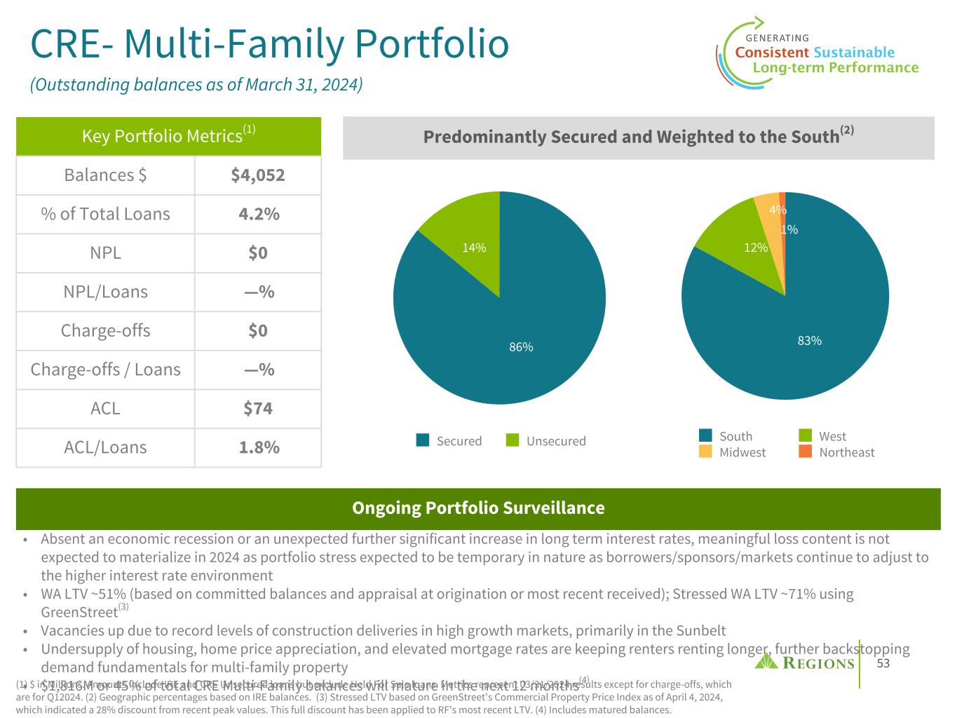 52 CRE- Office Portfolio (Outstanding balances as of March 31, 2024) (1) $ in Millions. Amounts include IRE and CRE Unsecured loans but exclude Held For Sale loans. Metrics represent 03/31/2024 results except for charge-offs, which are for Q124. (2) Stressed LTV based on GreenStreet's Commercial Property Price Index as of April 4, 2024, which indicated a 37% discount from recent peak values. This full discount has been applied to RF's most recent LTV. (3) Includes matured balances. • Business Offices secured = 94% / unsecured = 6% • WA LTV ~66% (based on committed balances and appraisal at origination or most recent received); Stressed WA LTV ~105% using GreenStreet(2) • 61% of secured outstanding IRE balances is located in the South of which 91% is Class A • Investment Grade tenants make up 80% of Single Tenant IRE balances • For Office loans maturing in the next 12 months, properties are 81% leased on average (80% occupied) • Class A properties outperforming; Secondary and tertiary market locations, particularly in the Sunbelt, also outperforming due to corporate and population in-migration • $773M or 51% of total CRE Office balances will mature in the next 12 months(3) Key Portfolio Metrics(1) Balances $ $1,504 % of Total Loans 1.6% NPL $161 NPL/Loans 10.7% Charge-offs $0 Charge-offs / Loans —% ACL $84 ACL/Loans 5.6% Ongoing Portfolio Surveillance 61% 39% Multi-Tenant Single Tenant 93% 7% Class A Class B Investor Real Estate Office Portfolio Overview 76% 24% Suburban Urban