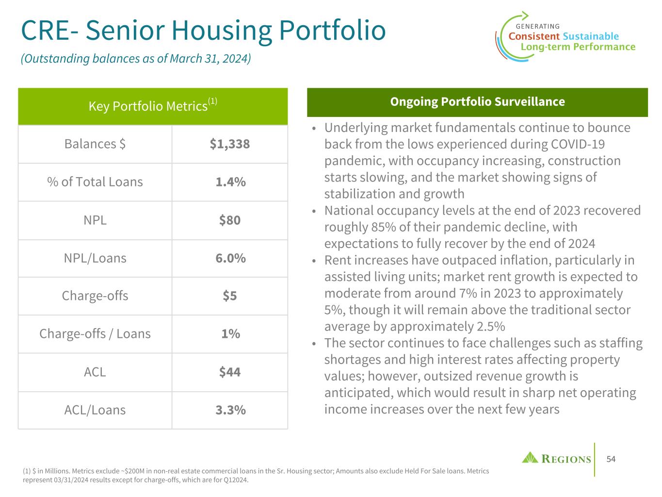 53 CRE- Multi-Family Portfolio (Outstanding balances as of March 31, 2024) Key Portfolio Metrics(1) Balances $ $4,052 % of Total Loans 4.2% NPL $0 NPL/Loans —% Charge-offs $0 Charge-offs / Loans —% ACL $74 ACL/Loans 1.8% • Absent an economic recession or an unexpected further significant increase in long term interest rates, meaningful loss content is not expected to materialize in 2024 as portfolio stress expected to be temporary in nature as borrowers/sponsors/markets continue to adjust to the higher interest rate environment • WA LTV ~51% (based on committed balances and appraisal at origination or most recent received); Stressed WA LTV ~71% using GreenStreet(3) • Vacancies up due to record levels of construction deliveries in high growth markets, primarily in the Sunbelt • Undersupply of housing, home price appreciation, and elevated mortgage rates are keeping renters renting longer, further backstopping demand fundamentals for multi-family property • $1,816M or 45% of total CRE Multi-Family balances will mature in the next 12 months(4) Predominantly Secured and Weighted to the South(2) 83% 12% 4% 1% South West Midwest Northeast 86% 14% Secured Unsecured Ongoing Portfolio Surveillance (1) $ in Millions. Amounts include IRE and CRE Unsecured loans but exclude Held For Sale loans. Metrics represent 03/31/2024 results except for charge-offs, which are for Q12024. (2) Geographic percentages based on IRE balances. (3) Stressed LTV based on GreenStreet's Commercial Property Price Index as of April 4, 2024, which indicated a 28% discount from recent peak values. This full discount has been applied to RF's most recent LTV. (4) Includes matured balances.