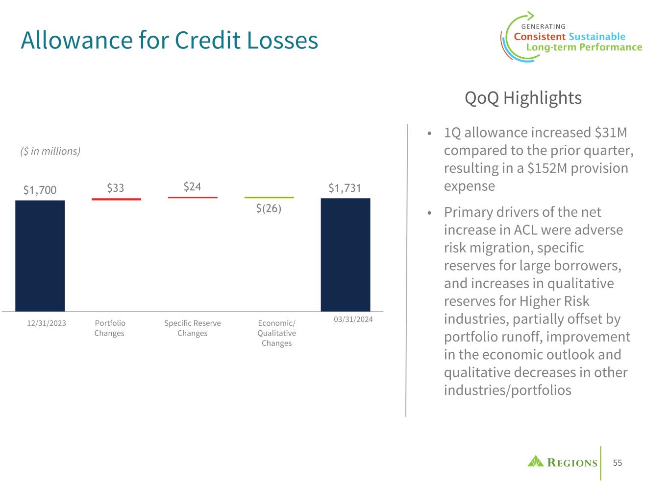 55 $1,700 $33 $24 $(26) $1,731 Allowance for Credit Losses 03/31/2024 • 1Q allowance increased $31M compared to the prior quarter, resulting in a $152M provision expense • Primary drivers of the net increase in ACL were adverse risk migration, specific reserves for large borrowers, and increases in qualitative reserves for Higher Risk industries, partially offset by portfolio runoff, improvement in the economic outlook and qualitative decreases in other industries/portfolios QoQ Highlights ($ in millions) 12/31/2023 Portfolio Changes Economic/ Qualitative Changes Specific Reserve Changes