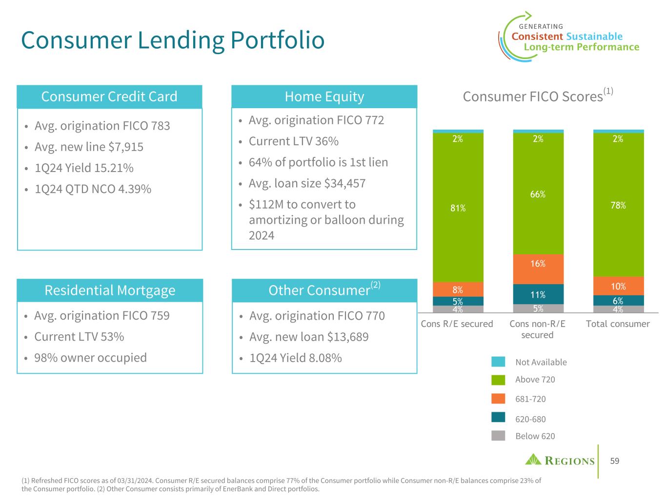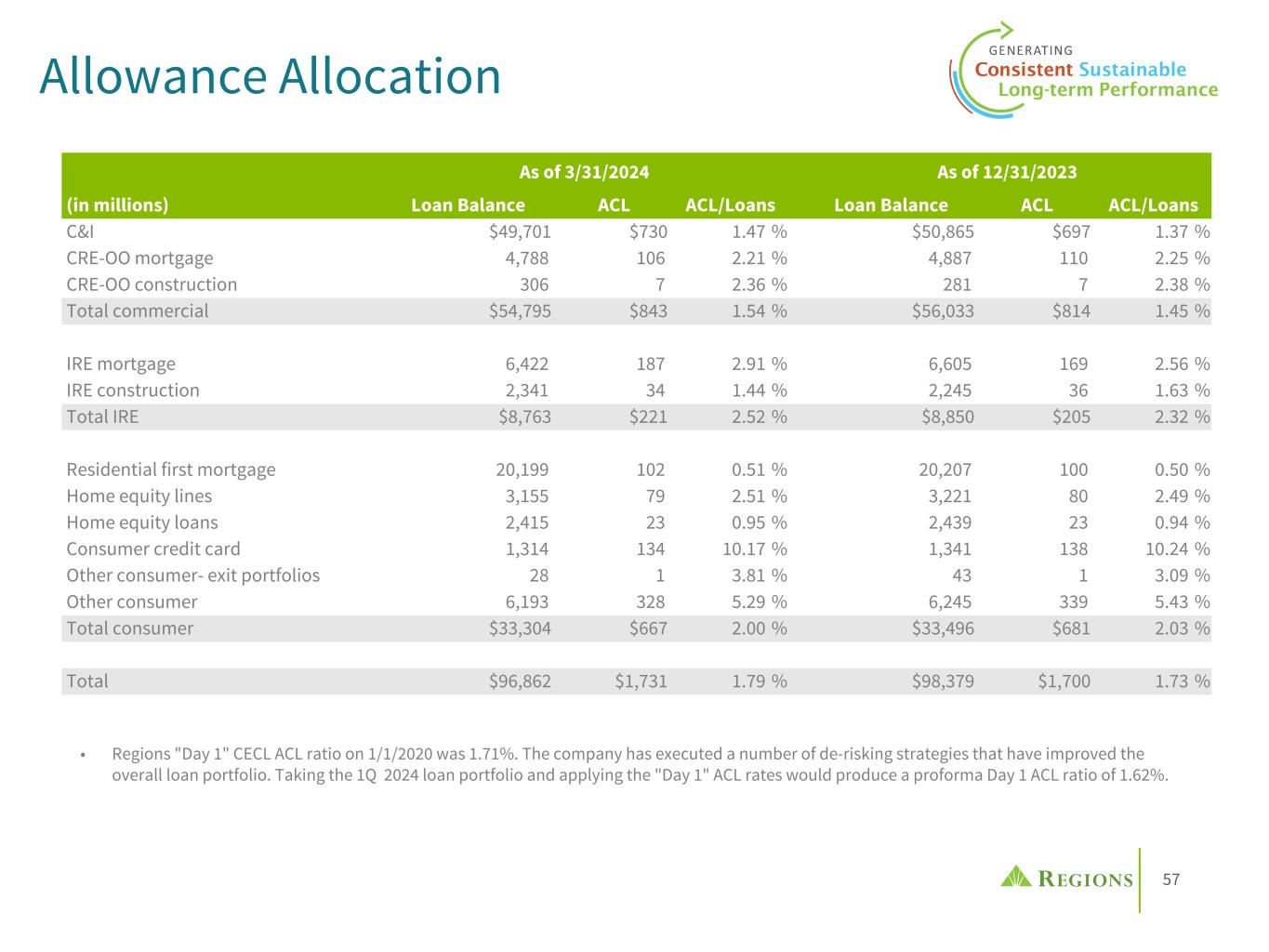 57 As of 3/31/2024 As of 12/31/2023 (in millions) Loan Balance ACL ACL/Loans Loan Balance ACL ACL/Loans C&I $49,701 $730 1.47 % $50,865 $697 1.37 % CRE-OO mortgage 4,788 106 2.21 % 4,887 110 2.25 % CRE-OO construction 306 7 2.36 % 281 7 2.38 % Total commercial $54,795 $843 1.54 % $56,033 $814 1.45 % IRE mortgage 6,422 187 2.91 % 6,605 169 2.56 % IRE construction 2,341 34 1.44 % 2,245 36 1.63 % Total IRE $8,763 $221 2.52 % $8,850 $205 2.32 % Residential first mortgage 20,199 102 0.51 % 20,207 100 0.50 % Home equity lines 3,155 79 2.51 % 3,221 80 2.49 % Home equity loans 2,415 23 0.95 % 2,439 23 0.94 % Consumer credit card 1,314 134 10.17 % 1,341 138 10.24 % Other consumer- exit portfolios 28 1 3.81 % 43 1 3.09 % Other consumer 6,193 328 5.29 % 6,245 339 5.43 % Total consumer $33,304 $667 2.00 % $33,496 $681 2.03 % Total $96,862 $1,731 1.79 % $98,379 $1,700 1.73 % Allowance Allocation • Regions "Day 1" CECL ACL ratio on 1/1/2020 was 1.71%. The company has executed a number of de-risking strategies that have improved the overall loan portfolio. Taking the 1Q 2024 loan portfolio and applying the "Day 1" ACL rates would produce a proforma Day 1 ACL ratio of 1.62%.