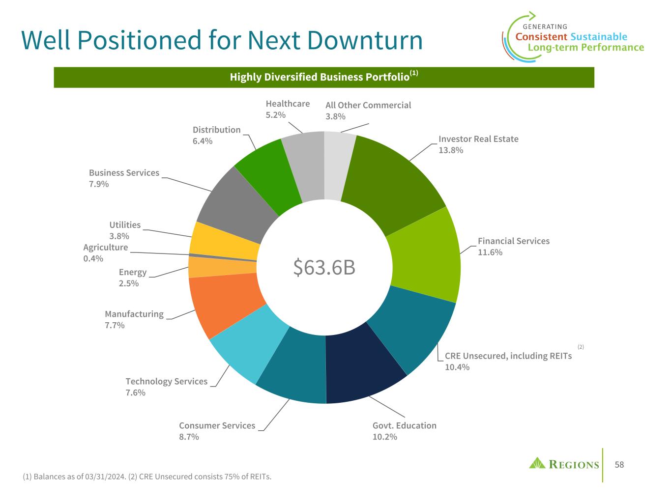 58 All Other Commercial 3.8% Investor Real Estate 13.8% Financial Services 11.6% CRE Unsecured, including REITs 10.4% Govt. Education 10.2% Consumer Services 8.7% Technology Services 7.6% Manufacturing 7.7% Energy 2.5% Agriculture 0.4% Utilities 3.8% Business Services 7.9% Distribution 6.4% Healthcare 5.2% Well Positioned for Next Downturn $63.6B Highly Diversified Business Portfolio(1) (1) Balances as of 03/31/2024. (2) CRE Unsecured consists 75% of REITs. (2)