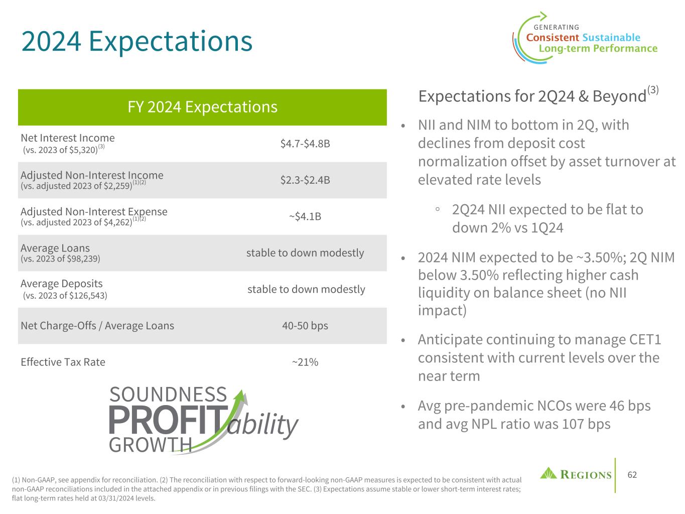 61 $25.0B SNC Portfolio (Outstanding balances as of March 31, 2024) • Improved portfolio composition and asset quality through focus on lower risk segments • 46% of balances consist of investment grade or select portfolios(1) • 10% of balances are leveraged(2) • Regions is agent or holds a title role for over half of SNC balances • For YTD 1Q24, Regions market share ranked above its Peer group median in the Agent Only league table standings(3) • ~2/3's of capital markets revenue is attributable to SNC-related relationship(4) • >3/4's of SNC-related relationships have generated an NIR fee or deposit(4) • ~3/4's of Corp Bank's top-50 NIR producing relationships are SNC-related(5) Portfolio CharacteristicsShared National Credit Balances by Sector CRE Unsecured Non-REIT 5% CRE Unsecured REIT 19% Financial Services 18% Technology Services 12% Commodities 9% Manufacturing 7% Distribution 7% Business Services 6% Other (Portfolios <5% of total) 17% (1) Select portfolios include Real Estate Investment Trusts (REITs), asset securitizations, investment grade utilities, subscription lines and Superior Transaction and Return Relationships (STARR). (2) Consistent with Moody's historical Regional Bank Survey definition. (3) Sourced from 2/29/24 LSEG Loan Connector (formerly Refinitive) Agent Only League Table Data where peers include: CFG, CMA, FHN, FITB, HBAN, HWC, KEY, MTB, PNC, SNV, TFC, USB, ZION. (4) Over the trailing 36-month period through 2/29/24. (5) Corporate Banking line of business over the trailing 36-month period through 2/29/24.