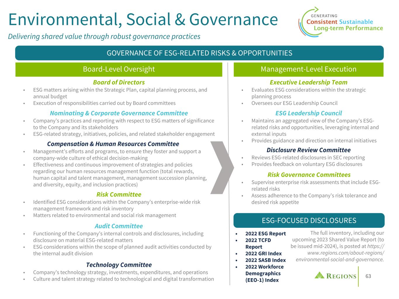 63 Environmental, Social & Governance Delivering shared value through robust governance practices GOVERNANCE OF ESG-RELATED RISKS & OPPORTUNITIES Board-Level Oversight Board of Directors • ESG matters arising within the Strategic Plan, capital planning process, and annual budget • Execution of responsibilities carried out by Board committees Compensation & Human Resources Committee • Management’s efforts and programs, to ensure they foster and support a company-wide culture of ethical decision-making • Effectiveness and continuous improvement of strategies and policies regarding our human resources management function (total rewards, human capital and talent management, management succession planning, and diversity, equity, and inclusion practices) Nominating & Corporate Governance Committee • Company’s practices and reporting with respect to ESG matters of significance to the Company and its stakeholders • ESG-related strategy, initiatives, policies, and related stakeholder engagement Management-Level Execution Risk Committee • Identified ESG considerations within the Company’s enterprise-wide risk management framework and risk inventory • Matters related to environmental and social risk management Audit Committee • Functioning of the Company’s internal controls and disclosures, including disclosure on material ESG-related matters • ESG considerations within the scope of planned audit activities conducted by the internal audit division Technology Committee • Company’s technology strategy, investments, expenditures, and operations • Culture and talent strategy related to technological and digital transformation Executive Leadership Team • Evaluates ESG considerations within the strategic planning process • Oversees our ESG Leadership Council ESG Leadership Council • Maintains an aggregated view of the Company’s ESG- related risks and opportunities, leveraging internal and external inputs • Provides guidance and direction on internal initiatives Disclosure Review Committee • Reviews ESG-related disclosures in SEC reporting • Provides feedback on voluntary ESG disclosures Risk Governance Committees • Supervise enterprise risk assessments that include ESG- related risks • Assess adherence to the Company’s risk tolerance and desired risk appetite ESG-FOCUSED DISCLOSURES • 2022 ESG Report • 2022 TCFD Report • 2022 GRI Index • 2022 SASB Index • 2022 Workforce Demographics (EEO-1) Index The full inventory, including our upcoming 2023 Shared Value Report (to be issued mid-2024), is posted at https:// www.regions.com/about-regions/ environmental-social-and-governance.