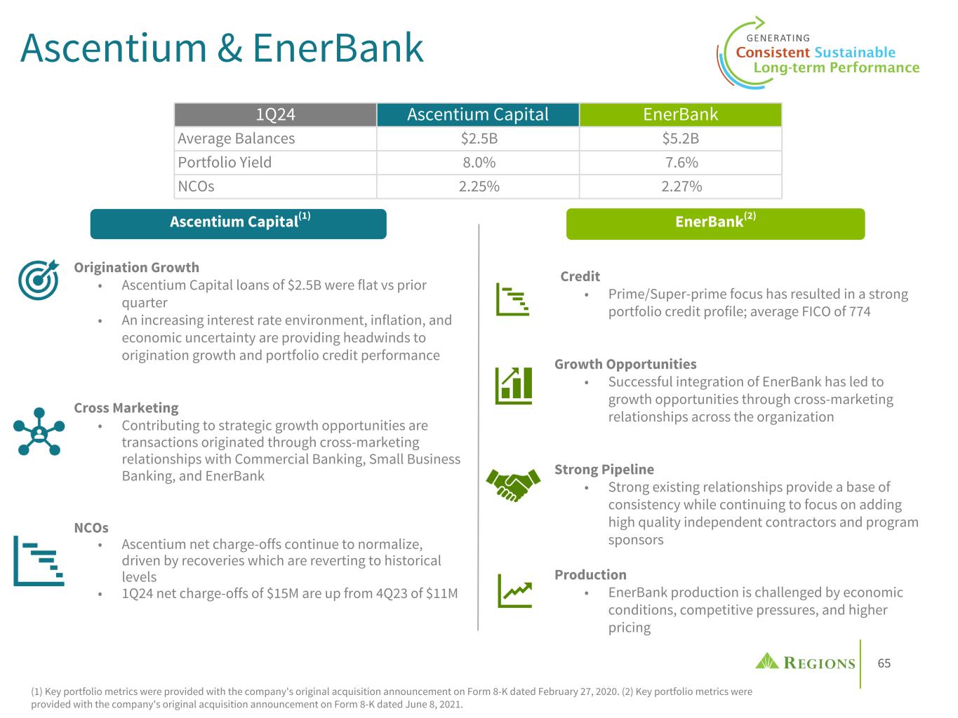 65 Ascentium & EnerBank Ascentium Capital(1) EnerBank(2) Origination Growth • Ascentium Capital loans of $2.5B were flat vs prior quarter • An increasing interest rate environment, inflation, and economic uncertainty are providing headwinds to origination growth and portfolio credit performance Cross Marketing • Contributing to strategic growth opportunities are transactions originated through cross-marketing relationships with Commercial Banking, Small Business Banking, and EnerBank NCOs • Ascentium net charge-offs continue to normalize, driven by recoveries which are reverting to historical levels • 1Q24 net charge-offs of $15M are up from 4Q23 of $11M (1) Key portfolio metrics were provided with the company's original acquisition announcement on Form 8-K dated February 27, 2020. (2) Key portfolio metrics were provided with the company's original acquisition announcement on Form 8-K dated June 8, 2021. 1Q24 Ascentium Capital EnerBank Average Balances $2.5B $5.2B Portfolio Yield 8.0% 7.6% NCOs 2.25% 2.27% Credit • Prime/Super-prime focus has resulted in a strong portfolio credit profile; average FICO of 774 Growth Opportunities • Successful integration of EnerBank has led to growth opportunities through cross-marketing relationships across the organization Strong Pipeline • Strong existing relationships provide a base of consistency while continuing to focus on adding high quality independent contractors and program sponsors Production • EnerBank production is challenged by economic conditions, competitive pressures, and higher pricing