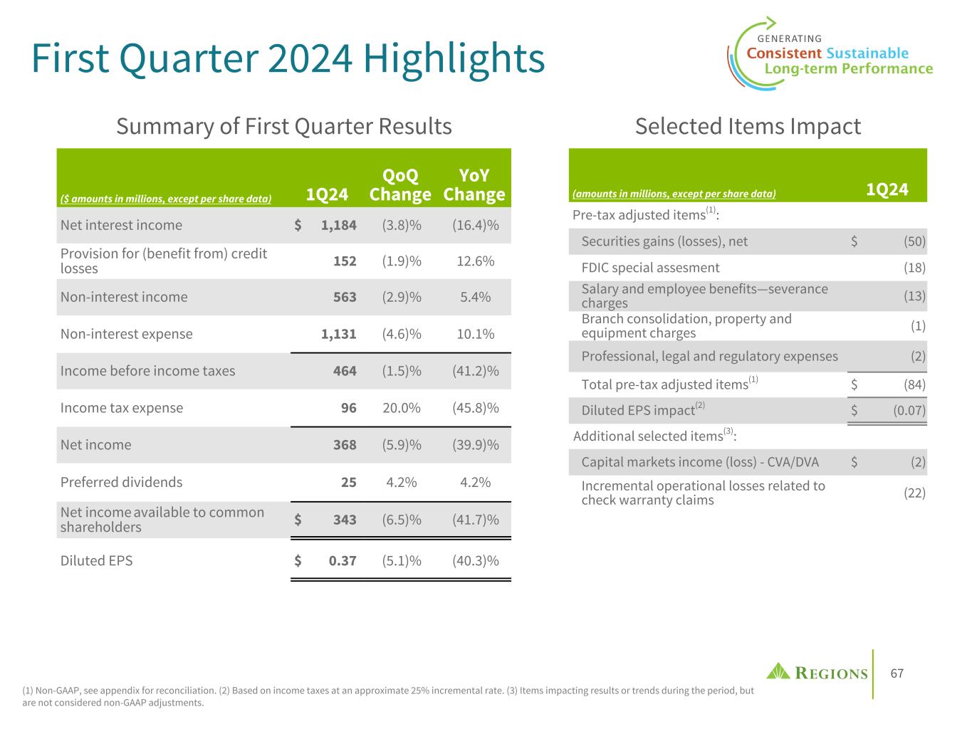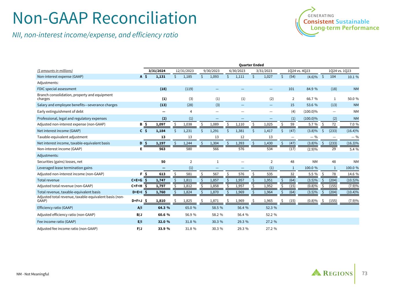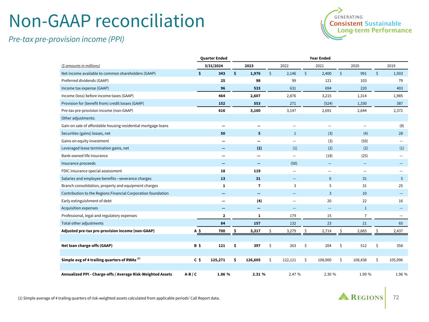 72 Non-GAAP reconciliation Pre-tax pre-provision income (PPI) Quarter Ended Year Ended ($ amounts in millions) 3/31/2024 2023 2022 2021 2020 2019 Net income available to common shareholders (GAAP) $ 343 $ 1,976 $ 2,146 $ 2,400 $ 991 $ 1,503 Preferred dividends (GAAP) 25 98 99 121 103 79 Income tax expense (GAAP) 96 533 631 694 220 403 Income (loss) before income taxes (GAAP) 464 2,607 2,876 3,215 1,314 1,985 Provision for (benefit from) credit losses (GAAP) 152 553 271 (524) 1,330 387 Pre-tax pre-provision income (non-GAAP) 616 3,160 3,147 2,691 2,644 2,372 Other adjustments: Gain on sale of affordable housing residential mortgage loans — — — — — (8) Securities (gains) losses, net 50 5 1 (3) (4) 28 Gains on equity investment — — — (3) (50) — Leveraged lease termination gains, net — (2) (1) (2) (2) (1) Bank-owned life insurance — — — (18) (25) — Insurance proceeds — — (50) — — — FDIC insurance special assessment 18 119 — — — — Salaries and employee benefits—severance charges 13 31 — 6 31 5 Branch consolidation, property and equipment charges 1 7 3 5 31 25 Contribution to the Regions Financial Corporation foundation — — — 3 10 — Early extinguishment of debt — (4) — 20 22 16 Acquisition expenses — — — — 1 — Professional, legal and regulatory expenses 2 1 179 15 7 — Total other adjustments 84 157 132 23 21 65 Adjusted pre-tax pre-provision income (non-GAAP) A $ 700 $ 3,317 $ 3,279 $ 2,714 $ 2,665 $ 2,437 Net loan charge-offs (GAAP) B $ 121 $ 397 $ 263 $ 204 $ 512 $ 358 Simple avg of 4 trailing quarters of RWAs (1) C $ 125,271 $ 126,605 $ 122,121 $ 108,900 $ 108,438 $ 105,996 Annualized PPI - Charge-offs / Average Risk-Weighted Assets A-B / C 1.86 % 2.31 % 2.47 % 2.30 % 1.99 % 1.96 % (1) Simple average of 4 trailing quarters of risk-weighted assets calculated from applicable periods' Call Report data.