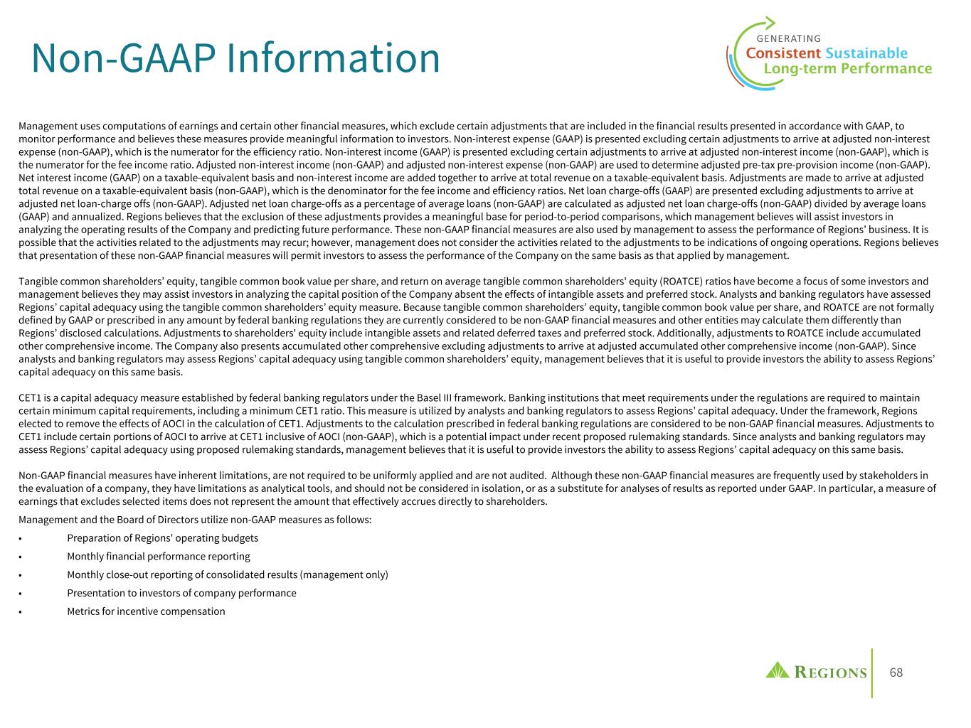 68 Management uses computations of earnings and certain other financial measures, which exclude certain adjustments that are included in the financial results presented in accordance with GAAP, to monitor performance and believes these measures provide meaningful information to investors. Non-interest expense (GAAP) is presented excluding certain adjustments to arrive at adjusted non-interest expense (non-GAAP), which is the numerator for the efficiency ratio. Non-interest income (GAAP) is presented excluding certain adjustments to arrive at adjusted non-interest income (non-GAAP), which is the numerator for the fee income ratio. Adjusted non-interest income (non-GAAP) and adjusted non-interest expense (non-GAAP) are used to determine adjusted pre-tax pre-provision income (non-GAAP). Net interest income (GAAP) on a taxable-equivalent basis and non-interest income are added together to arrive at total revenue on a taxable-equivalent basis. Adjustments are made to arrive at adjusted total revenue on a taxable-equivalent basis (non-GAAP), which is the denominator for the fee income and efficiency ratios. Net loan charge-offs (GAAP) are presented excluding adjustments to arrive at adjusted net loan-charge offs (non-GAAP). Adjusted net loan charge-offs as a percentage of average loans (non-GAAP) are calculated as adjusted net loan charge-offs (non-GAAP) divided by average loans (GAAP) and annualized. Regions believes that the exclusion of these adjustments provides a meaningful base for period-to-period comparisons, which management believes will assist investors in analyzing the operating results of the Company and predicting future performance. These non-GAAP financial measures are also used by management to assess the performance of Regions’ business. It is possible that the activities related to the adjustments may recur; however, management does not consider the activities related to the adjustments to be indications of ongoing operations. Regions believes that presentation of these non-GAAP financial measures will permit investors to assess the performance of the Company on the same basis as that applied by management. Tangible common shareholders’ equity, tangible common book value per share, and return on average tangible common shareholders' equity (ROATCE) ratios have become a focus of some investors and management believes they may assist investors in analyzing the capital position of the Company absent the effects of intangible assets and preferred stock. Analysts and banking regulators have assessed Regions’ capital adequacy using the tangible common shareholders’ equity measure. Because tangible common shareholders’ equity, tangible common book value per share, and ROATCE are not formally defined by GAAP or prescribed in any amount by federal banking regulations they are currently considered to be non-GAAP financial measures and other entities may calculate them differently than Regions’ disclosed calculations. Adjustments to shareholders' equity include intangible assets and related deferred taxes and preferred stock. Additionally, adjustments to ROATCE include accumulated other comprehensive income. The Company also presents accumulated other comprehensive excluding adjustments to arrive at adjusted accumulated other comprehensive income (non-GAAP). Since analysts and banking regulators may assess Regions’ capital adequacy using tangible common shareholders’ equity, management believes that it is useful to provide investors the ability to assess Regions’ capital adequacy on this same basis. CET1 is a capital adequacy measure established by federal banking regulators under the Basel III framework. Banking institutions that meet requirements under the regulations are required to maintain certain minimum capital requirements, including a minimum CET1 ratio. This measure is utilized by analysts and banking regulators to assess Regions’ capital adequacy. Under the framework, Regions elected to remove the effects of AOCI in the calculation of CET1. Adjustments to the calculation prescribed in federal banking regulations are considered to be non-GAAP financial measures. Adjustments to CET1 include certain portions of AOCI to arrive at CET1 inclusive of AOCI (non-GAAP), which is a potential impact under recent proposed rulemaking standards. Since analysts and banking regulators may assess Regions’ capital adequacy using proposed rulemaking standards, management believes that it is useful to provide investors the ability to assess Regions’ capital adequacy on this same basis. Non-GAAP financial measures have inherent limitations, are not required to be uniformly applied and are not audited. Although these non-GAAP financial measures are frequently used by stakeholders in the evaluation of a company, they have limitations as analytical tools, and should not be considered in isolation, or as a substitute for analyses of results as reported under GAAP. In particular, a measure of earnings that excludes selected items does not represent the amount that effectively accrues directly to shareholders. Management and the Board of Directors utilize non-GAAP measures as follows: • Preparation of Regions' operating budgets • Monthly financial performance reporting • Monthly close-out reporting of consolidated results (management only) • Presentation to investors of company performance • Metrics for incentive compensation Non-GAAP Information