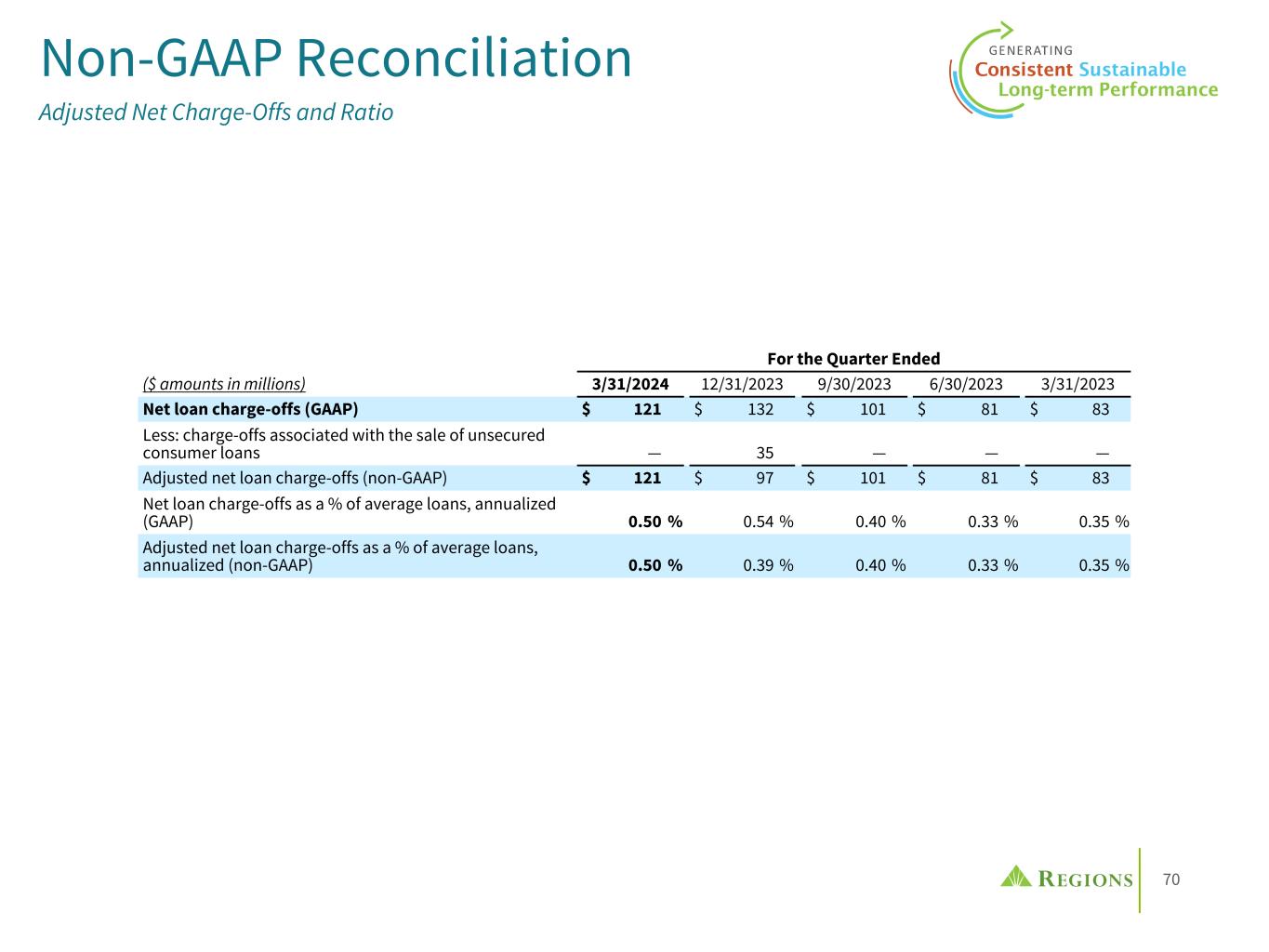 70 Non-GAAP Reconciliation Adjusted Net Charge-Offs and Ratio For the Quarter Ended ($ amounts in millions) 3/31/2024 12/31/2023 9/30/2023 6/30/2023 3/31/2023 Net loan charge-offs (GAAP) $ 121 $ 132 $ 101 $ 81 $ 83 Less: charge-offs associated with the sale of unsecured consumer loans — 35 — — — Adjusted net loan charge-offs (non-GAAP) $ 121 $ 97 $ 101 $ 81 $ 83 Net loan charge-offs as a % of average loans, annualized (GAAP) 0.50 % 0.54 % 0.40 % 0.33 % 0.35 % Adjusted net loan charge-offs as a % of average loans, annualized (non-GAAP) 0.50 % 0.39 % 0.40 % 0.33 % 0.35 %