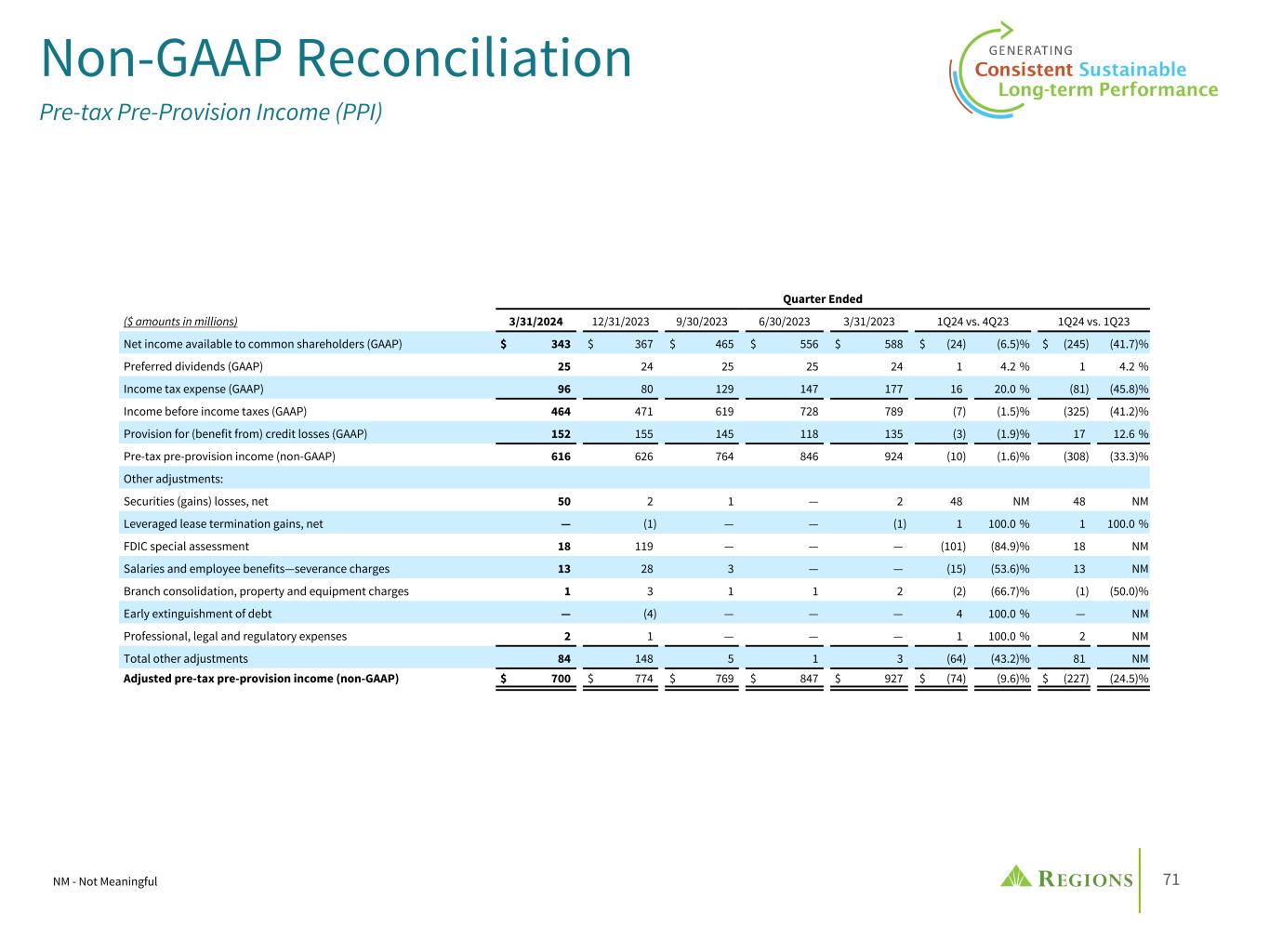 71 Non-GAAP Reconciliation Pre-tax Pre-Provision Income (PPI) Quarter Ended ($ amounts in millions) 3/31/2024 12/31/2023 9/30/2023 6/30/2023 3/31/2023 1Q24 vs. 4Q23 1Q24 vs. 1Q23 Net income available to common shareholders (GAAP) $ 343 $ 367 $ 465 $ 556 $ 588 $ (24) (6.5) % $ (245) (41.7) % Preferred dividends (GAAP) 25 24 25 25 24 1 4.2 % 1 4.2 % Income tax expense (GAAP) 96 80 129 147 177 16 20.0 % (81) (45.8) % Income before income taxes (GAAP) 464 471 619 728 789 (7) (1.5) % (325) (41.2) % Provision for (benefit from) credit losses (GAAP) 152 155 145 118 135 (3) (1.9) % 17 12.6 % Pre-tax pre-provision income (non-GAAP) 616 626 764 846 924 (10) (1.6) % (308) (33.3) % Other adjustments: Securities (gains) losses, net 50 2 1 — 2 48 NM 48 NM Leveraged lease termination gains, net — (1) — — (1) 1 100.0 % 1 100.0 % FDIC special assessment 18 119 — — — (101) (84.9) % 18 NM Salaries and employee benefits—severance charges 13 28 3 — — (15) (53.6) % 13 NM Branch consolidation, property and equipment charges 1 3 1 1 2 (2) (66.7) % (1) (50.0) % Early extinguishment of debt — (4) — — — 4 100.0 % — NM Professional, legal and regulatory expenses 2 1 — — — 1 100.0 % 2 NM Total other adjustments 84 148 5 1 3 (64) (43.2) % 81 NM Adjusted pre-tax pre-provision income (non-GAAP) $ 700 $ 774 $ 769 $ 847 $ 927 $ (74) (9.6) % $ (227) (24.5) % NM - Not Meaningful