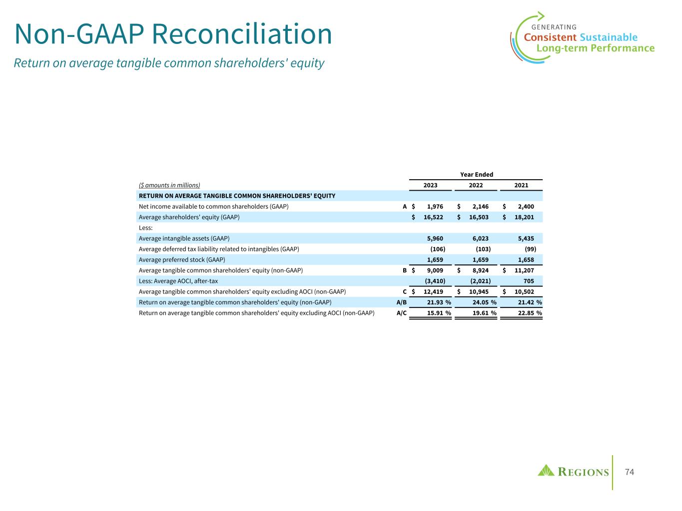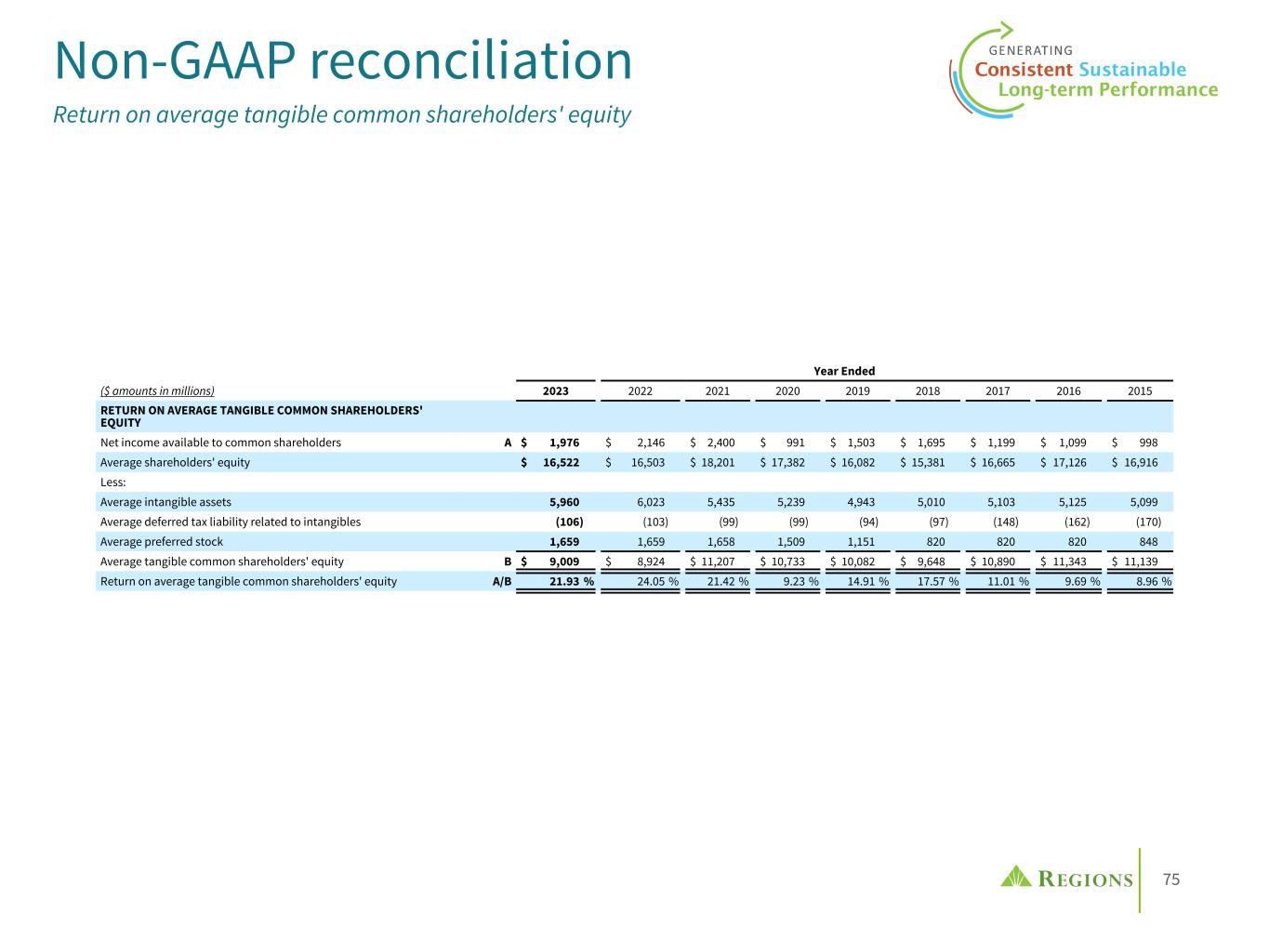 74 Year Ended ($ amounts in millions) 2023 2022 2021 RETURN ON AVERAGE TANGIBLE COMMON SHAREHOLDERS' EQUITY Net income available to common shareholders (GAAP) A $ 1,976 $ 2,146 $ 2,400 Average shareholders' equity (GAAP) $ 16,522 $ 16,503 $ 18,201 Less: Average intangible assets (GAAP) 5,960 6,023 5,435 Average deferred tax liability related to intangibles (GAAP) (106) (103) (99) Average preferred stock (GAAP) 1,659 1,659 1,658 Average tangible common shareholders' equity (non-GAAP) B $ 9,009 $ 8,924 $ 11,207 Less: Average AOCI, after-tax (3,410) (2,021) 705 Average tangible common shareholders' equity excluding AOCI (non-GAAP) C $ 12,419 $ 10,945 $ 10,502 Return on average tangible common shareholders' equity (non-GAAP) A/B 21.93 % 24.05 % 21.42 % Return on average tangible common shareholders' equity excluding AOCI (non-GAAP) A/C 15.91 % 19.61 % 22.85 % Non-GAAP Reconciliation Return on average tangible common shareholders' equity