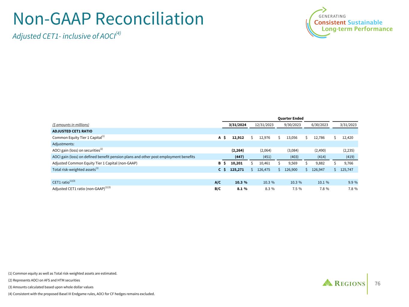 76 Quarter Ended ($ amounts in millions) 3/31/2024 12/31/2023 9/30/2023 6/30/2023 3/31/2023 ADJUSTED CET1 RATIO Common Equity Tier 1 Capital(1) A $ 12,912 $ 12,976 $ 13,056 $ 12,786 $ 12,420 Adjustments: AOCI gain (loss) on securities(2) (2,264) (2,064) (3,084) (2,490) (2,235) AOCI gain (loss) on defined benefit pension plans and other post employment benefits (447) (451) (403) (414) (419) Adjusted Common Equity Tier 1 Capital (non-GAAP) B $ 10,201 $ 10,461 $ 9,569 $ 9,882 $ 9,766 Total risk-weighted assets(1) C $ 125,271 $ 126,475 $ 126,900 $ 126,947 $ 125,747 CET1 ratio(1)(3) A/C 10.3 % 10.3 % 10.3 % 10.1 % 9.9 % Adjusted CET1 ratio (non-GAAP)(1)(3) B/C 8.1 % 8.3 % 7.5 % 7.8 % 7.8 % Non-GAAP Reconciliation Adjusted CET1- inclusive of AOCI(4) (1) Common equity as well as Total risk-weighted assets are estimated. (2) Represents AOCI on AFS and HTM securities (3) Amounts calculated based upon whole dollar values (4) Consistent with the proposed Basel III Endgame rules, AOCI for CF hedges remains excluded.