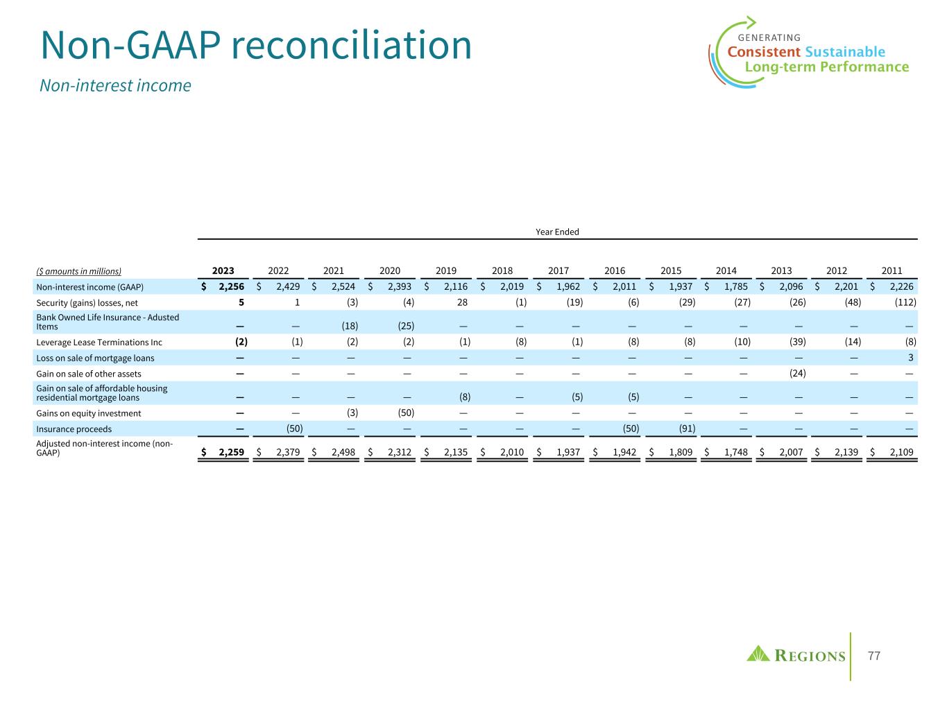 77 Non-GAAP reconciliation Non-interest income Year Ended ($ amounts in millions) 2023 2022 2021 2020 2019 2018 2017 2016 2015 2014 2013 2012 2011 Non-interest income (GAAP) $ 2,256 $ 2,429 $ 2,524 $ 2,393 $ 2,116 $ 2,019 $ 1,962 $ 2,011 $ 1,937 $ 1,785 $ 2,096 $ 2,201 $ 2,226 Security (gains) losses, net 5 1 (3) (4) 28 (1) (19) (6) (29) (27) (26) (48) (112) Bank Owned Life Insurance - Adusted Items — — (18) (25) — — — — — — — — — Leverage Lease Terminations Inc (2) (1) (2) (2) (1) (8) (1) (8) (8) (10) (39) (14) (8) Loss on sale of mortgage loans — — — — — — — — — — — — 3 Gain on sale of other assets — — — — — — — — — — (24) — — Gain on sale of affordable housing residential mortgage loans — — — — (8) — (5) (5) — — — — — Gains on equity investment — — (3) (50) — — — — — — — — — Insurance proceeds — (50) — — — — — (50) (91) — — — — Adjusted non-interest income (non- GAAP) $ 2,259 $ 2,379 $ 2,498 $ 2,312 $ 2,135 $ 2,010 $ 1,937 $ 1,942 $ 1,809 $ 1,748 $ 2,007 $ 2,139 $ 2,109