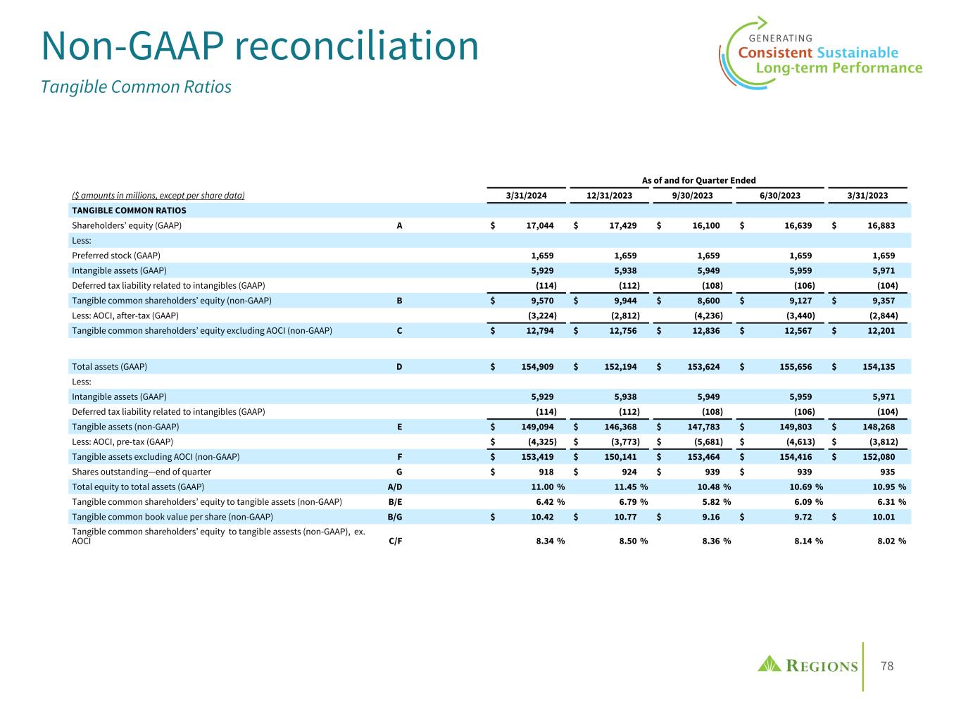 78 Non-GAAP reconciliation Tangible Common Ratios As of and for Quarter Ended ($ amounts in millions, except per share data) 3/31/2024 12/31/2023 9/30/2023 6/30/2023 3/31/2023 TANGIBLE COMMON RATIOS Shareholders’ equity (GAAP) A $ 17,044 $ 17,429 $ 16,100 $ 16,639 $ 16,883 Less: Preferred stock (GAAP) 1,659 1,659 1,659 1,659 1,659 Intangible assets (GAAP) 5,929 5,938 5,949 5,959 5,971 Deferred tax liability related to intangibles (GAAP) (114) (112) (108) (106) (104) Tangible common shareholders’ equity (non-GAAP) B $ 9,570 $ 9,944 $ 8,600 $ 9,127 $ 9,357 Less: AOCI, after-tax (GAAP) (3,224) (2,812) (4,236) (3,440) (2,844) Tangible common shareholders’ equity excluding AOCI (non-GAAP) C $ 12,794 $ 12,756 $ 12,836 $ 12,567 $ 12,201 Total assets (GAAP) D $ 154,909 $ 152,194 $ 153,624 $ 155,656 $ 154,135 Less: Intangible assets (GAAP) 5,929 5,938 5,949 5,959 5,971 Deferred tax liability related to intangibles (GAAP) (114) (112) (108) (106) (104) Tangible assets (non-GAAP) E $ 149,094 $ 146,368 $ 147,783 $ 149,803 $ 148,268 Less: AOCI, pre-tax (GAAP) $ (4,325) $ (3,773) $ (5,681) $ (4,613) $ (3,812) Tangible assets excluding AOCI (non-GAAP) F $ 153,419 $ 150,141 $ 153,464 $ 154,416 $ 152,080 Shares outstanding—end of quarter G $ 918 $ 924 $ 939 $ 939 935 Total equity to total assets (GAAP) A/D 11.00 % 11.45 % 10.48 % 10.69 % 10.95 % Tangible common shareholders’ equity to tangible assets (non-GAAP) B/E 6.42 % 6.79 % 5.82 % 6.09 % 6.31 % Tangible common book value per share (non-GAAP) B/G $ 10.42 $ 10.77 $ 9.16 $ 9.72 $ 10.01 Tangible common shareholders’ equity to tangible assests (non-GAAP), ex. AOCI C/F 8.34 % 8.50 % 8.36 % 8.14 % 8.02 %