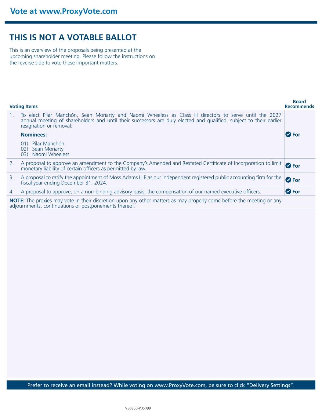 THIS IS NOT A VOTABLE BALLOT This is an overview of the proposals being presented at the upcoming shareholder meeting. Please follow the instructions on the reverse side to vote these important matters. Vote at www.ProxyVote.com Prefer to receive an email instead? While voting on www.ProxyVote.com, be sure to click “Delivery Settings”. Voting Items Board Recommends V36850-P05099 1. To elect Pilar Manchón, Sean Moriarty and Naomi Wheeless as Class III directors to serve until the 2027 annual meeting of shareholders and until their successors are duly elected and qualified, subject to their earlier resignation or removal: For Nominees: 01) Pilar Manchón 02) Sean Moriarty 03) Naomi Wheeless 2. A proposal to approve an amendment to the Company’s Amended and Restated Certificate of Incorporation to limit monetary liability of certain officers as permitted by law. For 3. A proposal to ratify the appointment of Moss Adams LLP as our independent registered public accounting firm for the fiscal year ending December 31, 2024. For 4. A proposal to approve, on a non-binding advisory basis, the compensation of our named executive officers. For NOTE: The proxies may vote in their discretion upon any other matters as may properly come before the meeting or any adjournments, continuations or postponements thereof.
