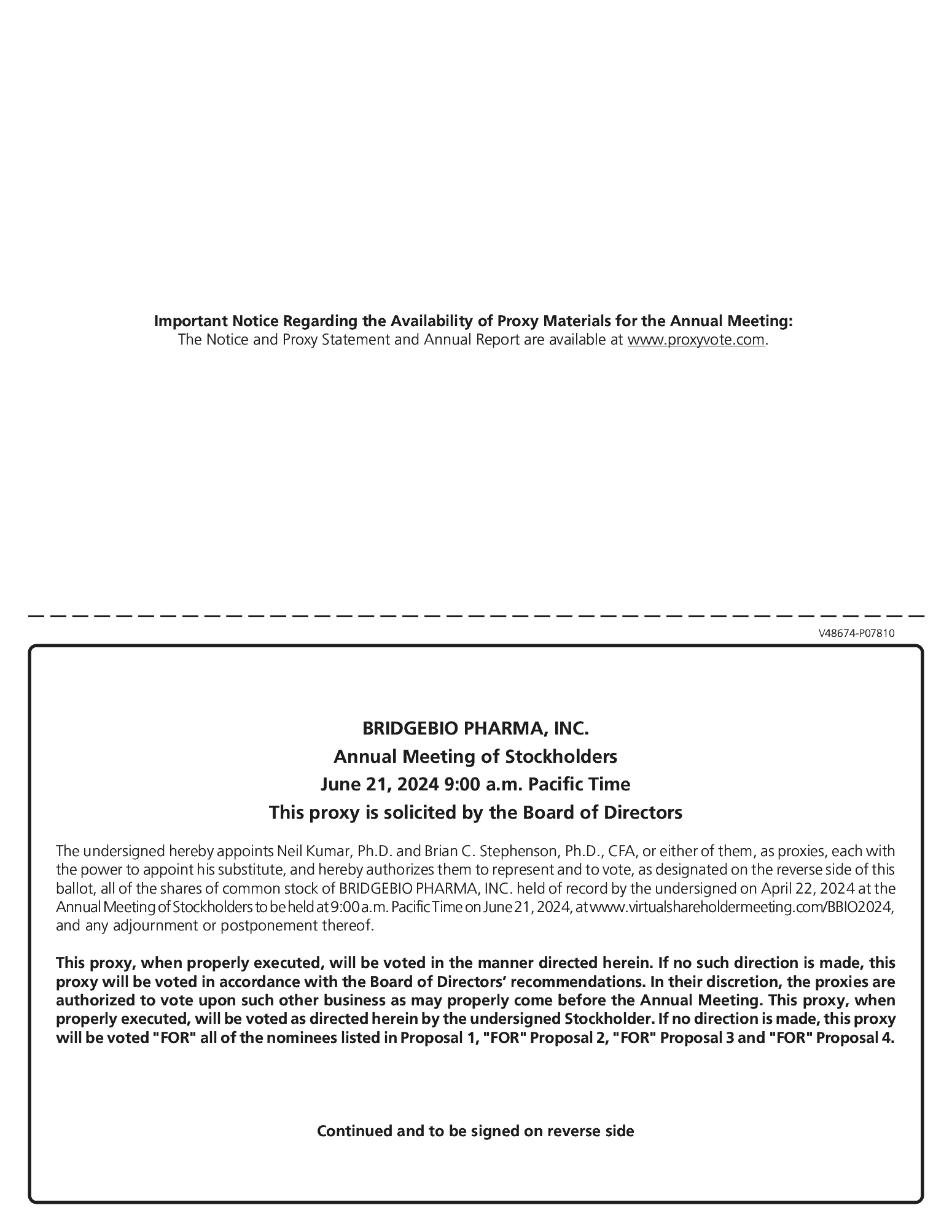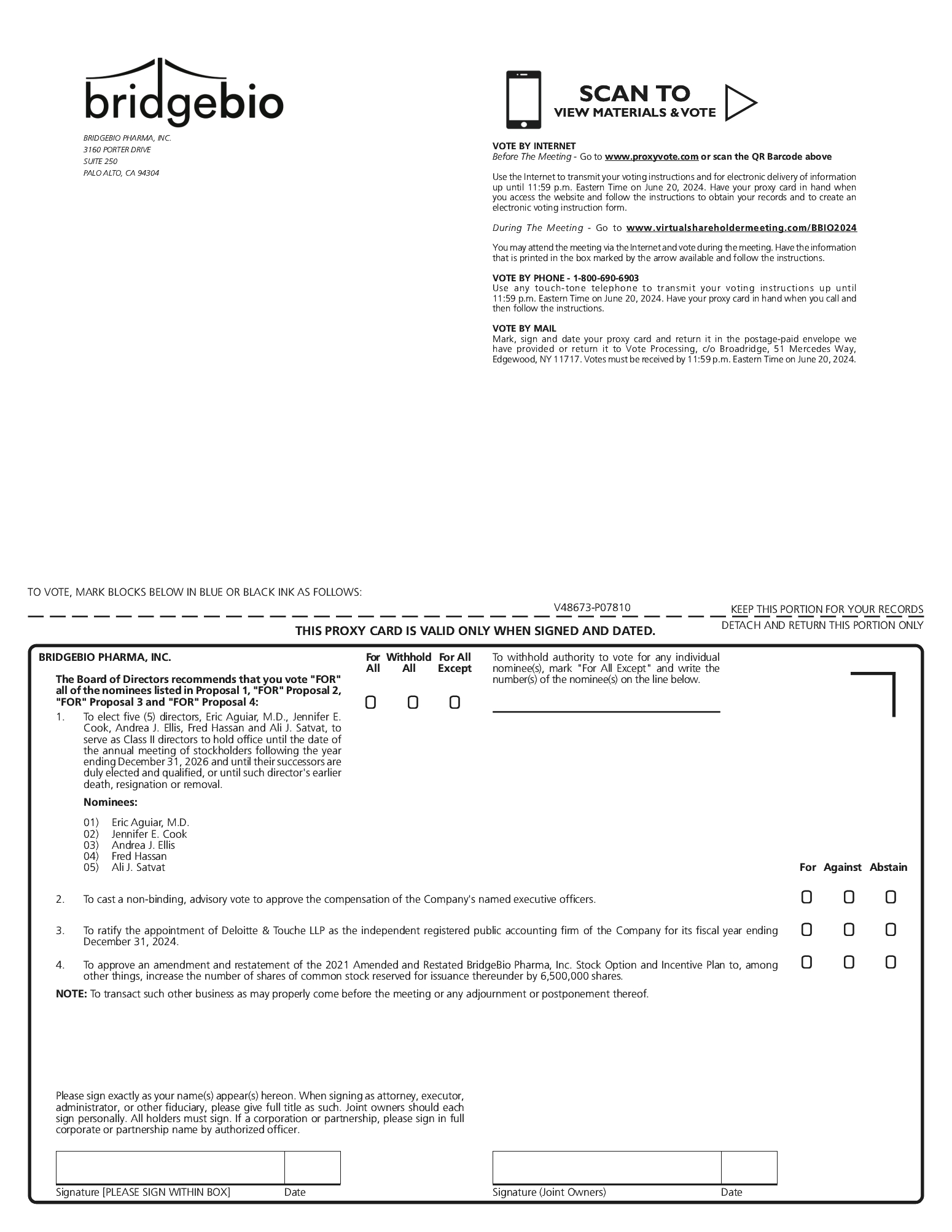 4. | To approve an amendment and restatement of the 2021 Amended and Restated BridgeBio Pharma, Inc. Stock Option and Incentive Plan to, among other things, increase the number of shares of common stock reserved for issuance thereunder by 6,500,000 shares. |