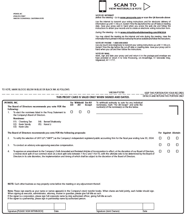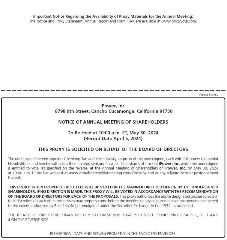 The Annual Meeting of the shareholders of iPower Inc., a Nevada corporation (“Company”), will be held on May 30, 2024, at 10:00 a.m. (ET), and will be accessible virtually at www.virtualshareholdermeeting.com/IPW2024, for the following purposes: