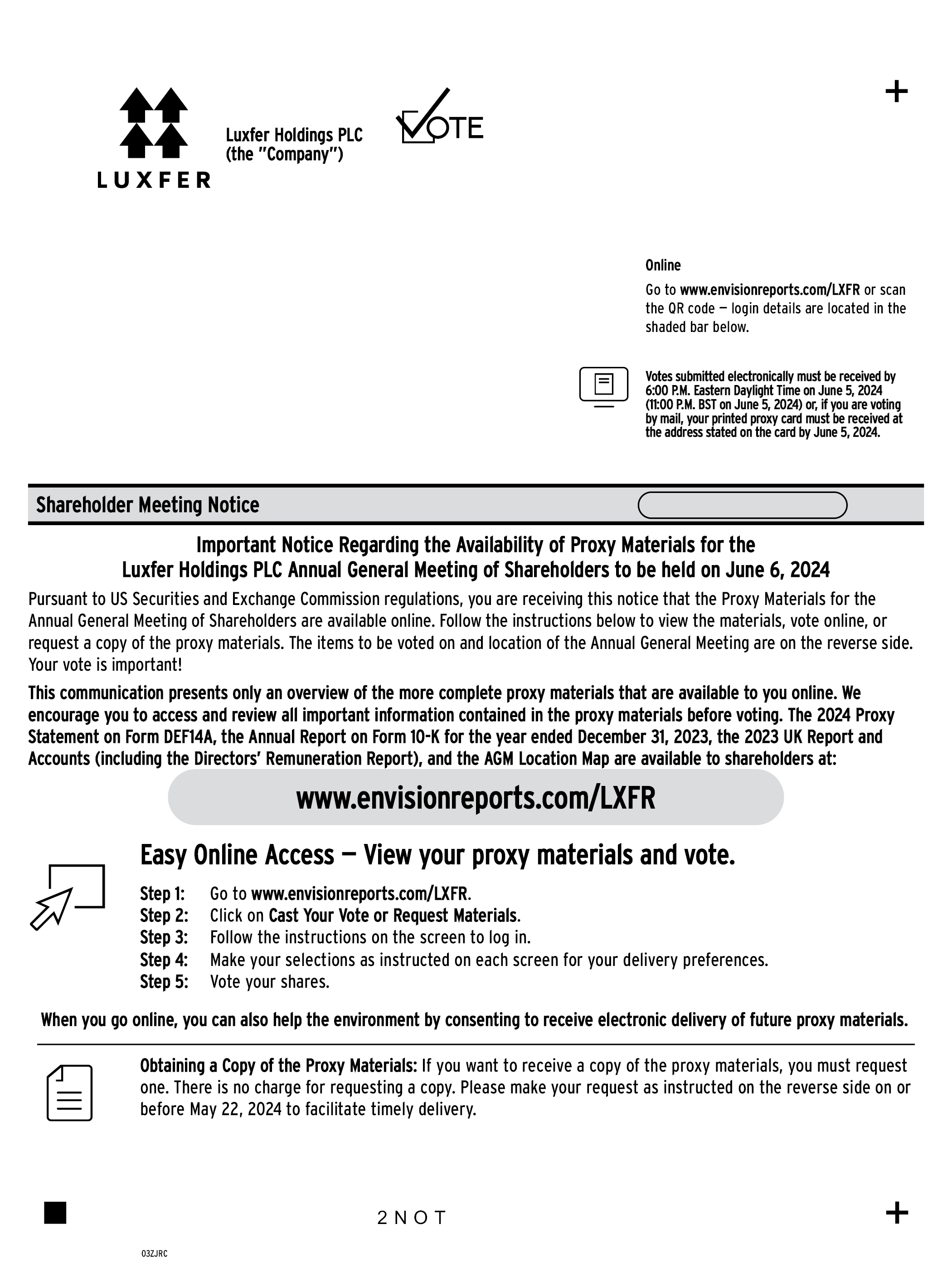 Luxfer Holdings PLC (the ”Company”) + Online Go to www.envisionreports.com/LXFR or scan the QR code — login details are located in the shaded bar below. Votes submitted electronically must be received by 6:00 P.M. Eastern Daylight Time on June 5, 2024 (11:00 P.M. BST on June 5, 2024) or, if you are voting by mail, your printed proxy card must be received at the address stated on the card by June 5, 2024. Shareholder Meeting Notice Important Notice Regarding the Availability of Proxy Materials for the Luxfer Holdings PLC Annual General Meeting of Shareholders to be held on June 6, 2024 Pursuant to US Securities and Exchange Commission regulations, you are receiving this notice that the Proxy Materials for the Annual General Meeting of Shareholders are available online. Follow the instructions below to view the materials, vote online, or request a copy of the proxy materials. The items to be voted on and location of the Annual General Meeting are on the reverse side. Your vote is important! www.envisionreports.com/LXFR This communication presents only an overview of the more complete proxy materials that are available to you online. We encourage you to access and review all important information contained in the proxy materials before voting. The 2024 Proxy Statement on Form DEF14A, the Annual Report on Form 10-K for the year ended December 31, 2023, the 2023 UK Report and Accounts (including the Directors’ Remuneration Report), and the AGM Location Map are available to shareholders at: Easy Online Access — View your proxy materials and vote. Step 1: Go to www.envisionreports.com/LXFR. Step 2: Click on Cast Your Vote or Request Materials. Step 3: Follow the instructions on the screen to log in. Step 4: Make your selections as instructed on each screen for your delivery preferences. Step 5: Vote your shares. When you go online, you can also help the environment by consenting to receive electronic delivery of future proxy materials. Obtaining a Copy of the Proxy Materials: If you want to receive a copy of the proxy materials, you must request one. There is no charge for requesting a copy. Please make your request as instructed on the reverse side on or before May 22, 2024 to facilitate timely delivery. 03ZJRC 2 N O T +