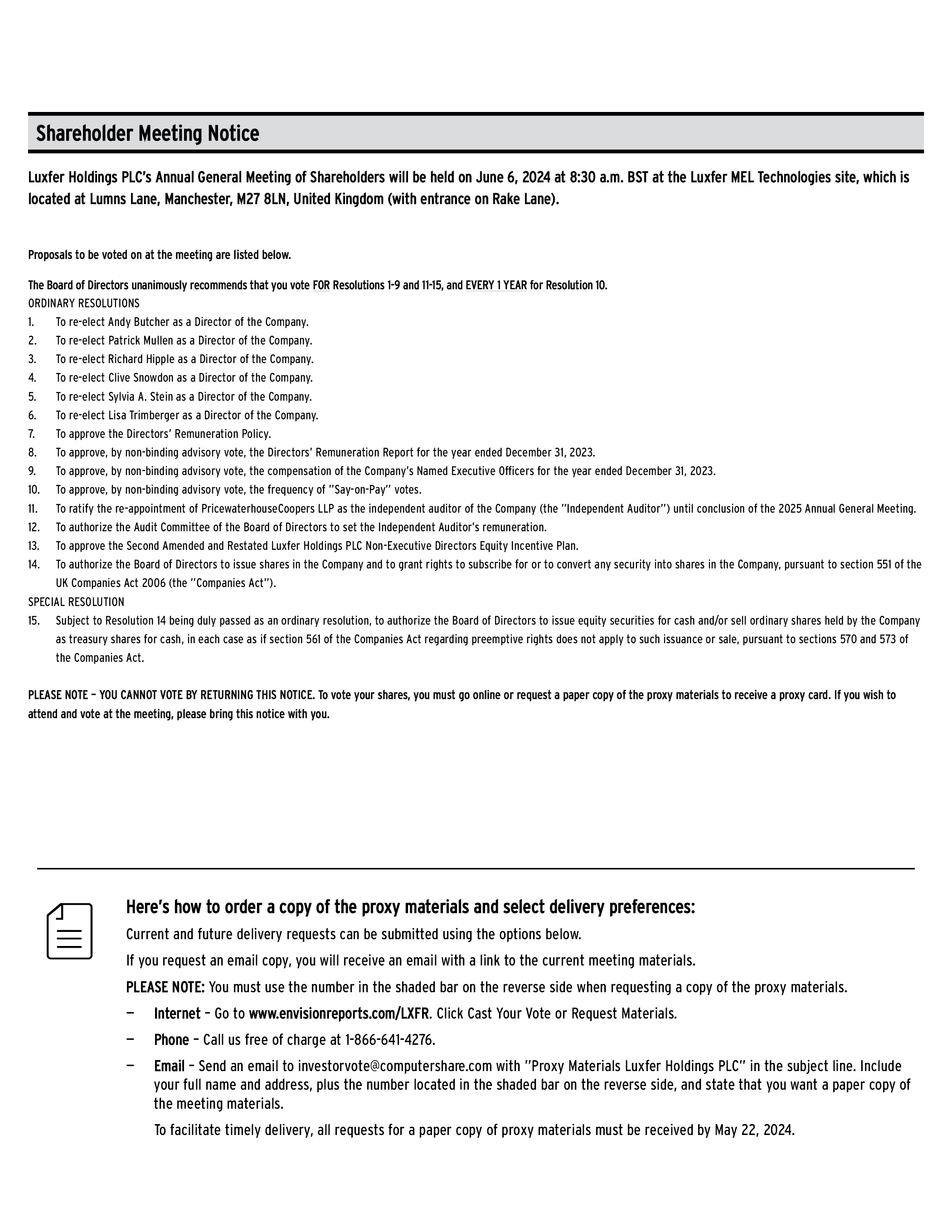 Shareholder Meeting Notice Luxfer Holdings PLC’s Annual General Meeting of Shareholders will be held on June 6, 2024 at 8:30 a.m. BST at the Luxfer MEL Technologies site, which is located at Lumns Lane, Manchester, M27 8LN, United Kingdom (with entrance on Rake Lane). Proposals to be voted on at the meeting are listed below. The Board of Directors unanimously recommends that you vote FOR Resolutions 1-9 and 11-15, and EVERY 1 YEAR for Resolution 10. ORDINARY RESOLUTIONS 1. To re-elect Andy Butcher as a Director of the Company. 2. To re-elect Patrick Mullen as a Director of the Company. 3. To re-elect Richard Hipple as a Director of the Company. 4. To re-elect Clive Snowdon as a Director of the Company. 5. To re-elect Sylvia A. Stein as a Director of the Company. 6. To re-elect Lisa Trimberger as a Director of the Company. 7. To approve the Directors’ Remuneration Policy. 8. To approve, by non-binding advisory vote, the Directors’ Remuneration Report for the year ended December 31, 2023. 9. To approve, by non-binding advisory vote, the compensation of the Company’s Named Executive Officers for the year ended December 31, 2023. 10. To approve, by non-binding advisory vote, the frequency of ”Say-on-Pay” votes. 11. To ratify the re-appointment of PricewaterhouseCoopers LLP as the independent auditor of the Company (the ”Independent Auditor”) until conclusion of the 2025 Annual General Meeting. 12. To authorize the Audit Committee of the Board of Directors to set the Independent Auditor’s remuneration. 13. To approve the Second Amended and Restated Luxfer Holdings PLC Non-Executive Directors Equity Incentive Plan. 14. To authorize the Board of Directors to issue shares in the Company and to grant rights to subscribe for or to convert any security into shares in the Company, pursuant to section 551 of the UK Companies Act 2006 (the ”Companies Act”). SPECIAL RESOLUTION 15. Subject to Resolution 14 being duly passed as an ordinary resolution, to authorize the Board of Directors to issue equity securities for cash and/or sell ordinary shares held by the Company as treasury shares for cash, in each case as if section 561 of the Companies Act regarding preemptive rights does not apply to such issuance or sale, pursuant to sections 570 and 573 of the Companies Act. PLEASE NOTE – YOU CANNOT VOTE BY RETURNING THIS NOTICE. To vote your shares, you must go online or request a paper copy of the proxy materials to receive a proxy card. If you wish to attend and vote at the meeting, please bring this notice with you. Here’s how to order a copy of the proxy materials and select delivery preferences: Current and future delivery requests can be submitted using the options below. If you request an email copy, you will receive an email with a link to the current meeting materials. PLEASE NOTE: You must use the number in the shaded bar on the reverse side when requesting a copy of the proxy materials. • Internet – Go to www.envisionreports.com/LXFR. Click Cast Your Vote or Request Materials. • Phone – Call us free of charge at 1-866-641-4276. • Email – Send an email to investorvote@computershare.com with ”Proxy Materials Luxfer Holdings PLC” in the subject line. Include your full name and address, plus the number located in the shaded bar on the reverse side, and state that you want a paper copy of the meeting materials. To facilitate timely delivery, all requests for a paper copy of proxy materials must be received by May 22, 2024.