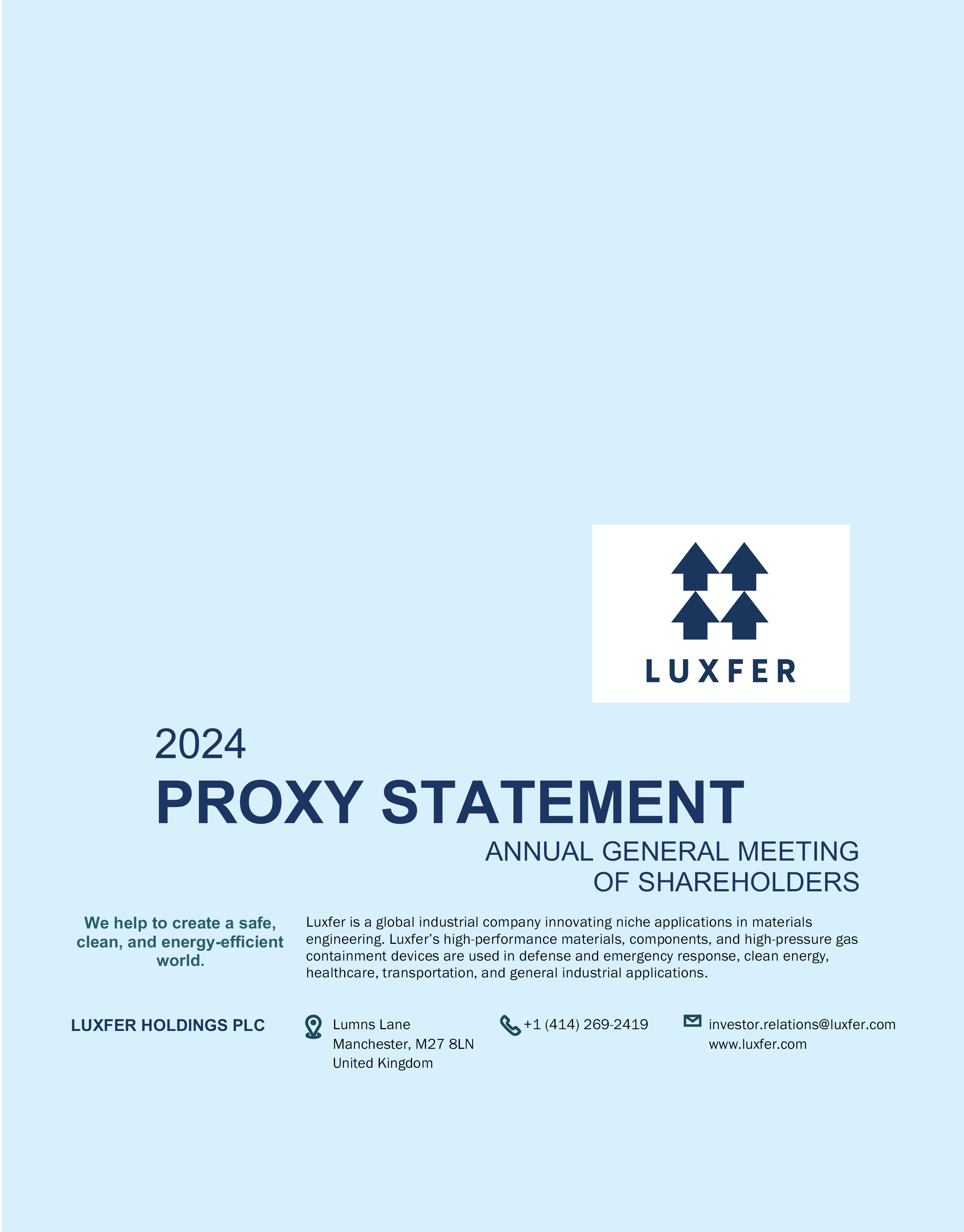 Dear Luxfer Shareholders, It is my pleasure to share the notice of Luxfer’s 2024 Annual General Meeting of Shareholders (“AGM” or the “Annual General Meeting”). The AGM will be held at the Luxfer MEL Technologies site, located at Lumns Lane, Manchester, M27 8LN, United Kingdom, on June 6, 2024, at 8:30 a.m. BST. The formal notice of the AGM is set out on page 1 of this document (the “Notice”). As a holder of ordinary shares, you may attend and/or vote at the AGM, or you may appoint another person as your proxy. To be valid, a form of proxy must be submitted in accordance with the instructions set out in the section entitled “2024 Annual General Meeting Information” on page 2. I would like to take this opportunity to reflect on the past year and outline our vision for the future. Despite facing unprecedented challenges in 2023, we remained committed to our long-term strategy to create shareholder and customer value through the development and supply of sustainable transportation solutions and life-saving defense, medical and emergency response equipment. Throughout 2023, we continued to serve niche end markets, where our technical know-how and manufacturing expertise combine to deliver a superior product. While we launched innovative products and entered new markets across a range of applications, several factors adversely impacted Luxfer’s performance in 2023, especially in the second half of the year. Record-high input costs for key raw materials presented significant challenges for our global operations and commercial teams to remain competitive without sacrificing market share. Additionally, our Elektron business experienced low demand in key end markets. Despite these obstacles, our Gas Cylinders segment saw solid growth, particularly in self-contained breathing apparatus (SCBA) applications. |