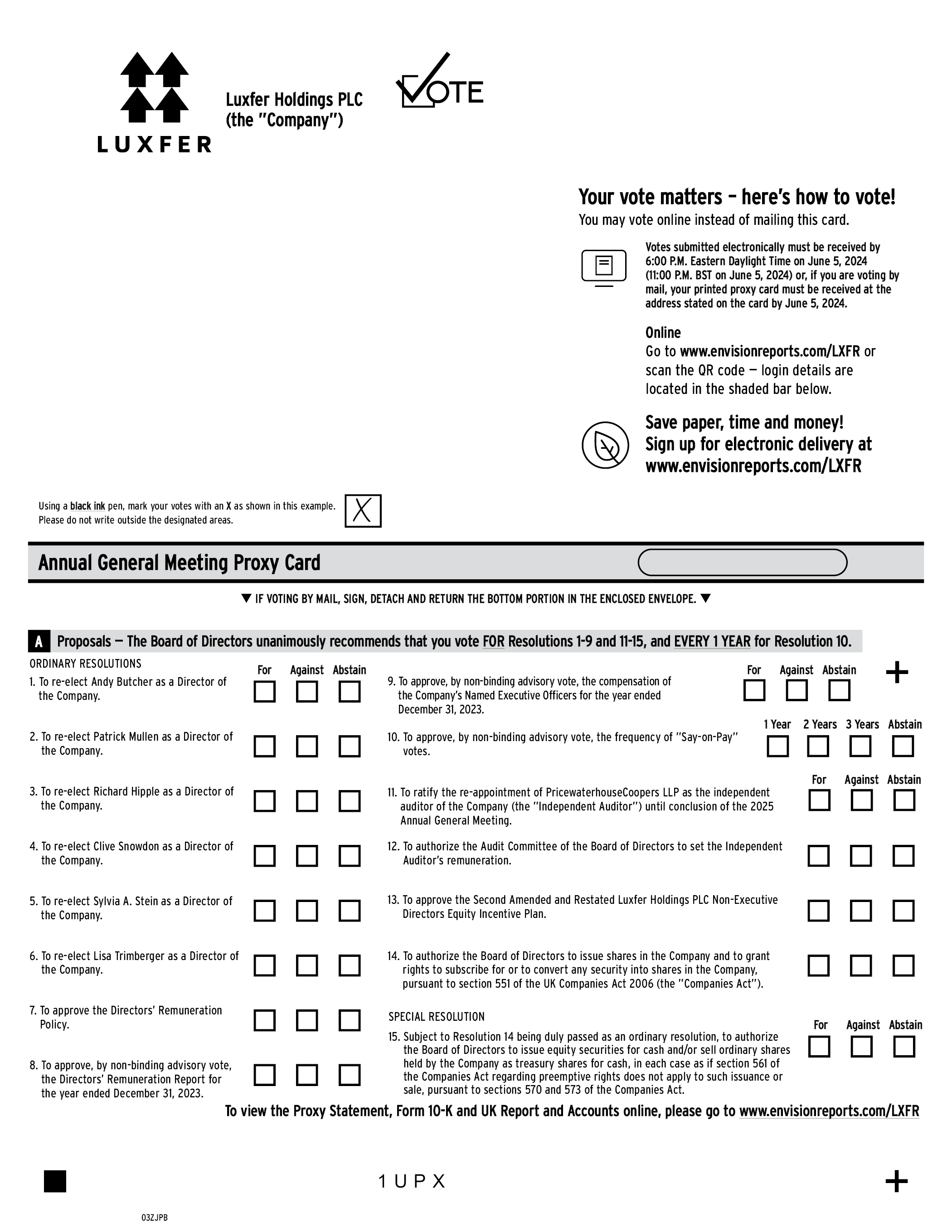 Luxfer Holdings PLC (the “Company”) You may vote online instead of mailing this card. Online Go to www.envisionreports.com/LXFR or scan the QR code — login details are located in the shaded bar below. Save paper, time and money! Sign up for electronic delivery at www.envisionreports.com/LXFR Votes submitted electronically must be received by 6:00 P.M. Eastern Daylight Time on June 5, 2024 (11:00 P.M. BST on June 5, 2024) or, if you are voting by mail, your printed proxy card must be received at the address stated on the card by June 5, 2024. Your vote matters – here’s how to vote! Using a black ink pen, mark your votes with an X as shown in this example. Please do not write outside the designated areas. IF VOTING BY MAIL, SIGN, DETACH AND RETURN THE BOTTOM PORTION IN THE ENCLOSED ENVELOPE. Annual General Meeting Proxy Card Proposals — The Board of Directors recommend a vote FOR all the nominees listed, FOR Proposals X – X and for every X YEARS on Proposal X. 1 Year 2 Years 3 Years Abstain 9. To approve, by non-binding advisory vote, the compensation of the Company’s Named Executive Officers for the year ended December 31, 2023. 1 U P X 15. Subject to Resolution 14 being duly passed as an ordinary resolution, to authorize the Board of Directors to issue equity securities for cash and/or sell ordinary shares held by the Company as treasury shares for cash, in each case as if section 561 of the Companies Act regarding preemptive rights does not apply to such issuance or sale, pursuant to sections 570 and 573 of the Companies Act. 03ZJPB + + A of Directors unanimously recommends that you vote FOR Resolutions 1-9 and 11-15, and EVERY 1 YEAR for Resolution 10. To view the Proxy Statement, Form 10-K and UK Report and Accounts online, please go to www.envisionreports.com/LXFR 1. To re-elect Andy Butcher as a Director of the Company. 2. To re-elect Patrick Mullen as a Director of the Company. 3. To re-elect Richard Hipple as a Director of the Company. 4. To re-elect Clive Snowdon as a Director of the Company. 5. To re-elect Sylvia A. Stein as a Director of the Company. ORDINARY RESOLUTIONS For Against Abstain 6. To re-elect Lisa Trimberger as a Director of the Company. 13. To approve the Second Amended and Restated Luxfer Holdings PLC Non-Executive Directors Equity Incentive Plan. 7. To approve the Directors’ Remuneration Policy. 10. To approve, by non-binding advisory vote, the frequency of “Say-on-Pay” votes. 11. To ratify the re-appointment of PricewaterhouseCoopers LLP as the independent auditor of the Company (the “Independent Auditor”) until conclusion of the 2025 Annual General Meeting. 12. To authorize the Audit Committee of the Board of Directors to set the Independent Auditor’s remuneration. 14. To authorize the Board of Directors to issue shares in the Company and to grant rights to subscribe for or to convert any security into shares in the Company, pursuant to section 551 of the UK Companies Act 2006 (the “Companies Act”). For Against Abstain SPECIAL RESOLUTION For Against Abstain For Against Abstain 8. To approve, by non-binding advisory vote, the Directors’ Remuneration Report for the year ended December 31, 2023.