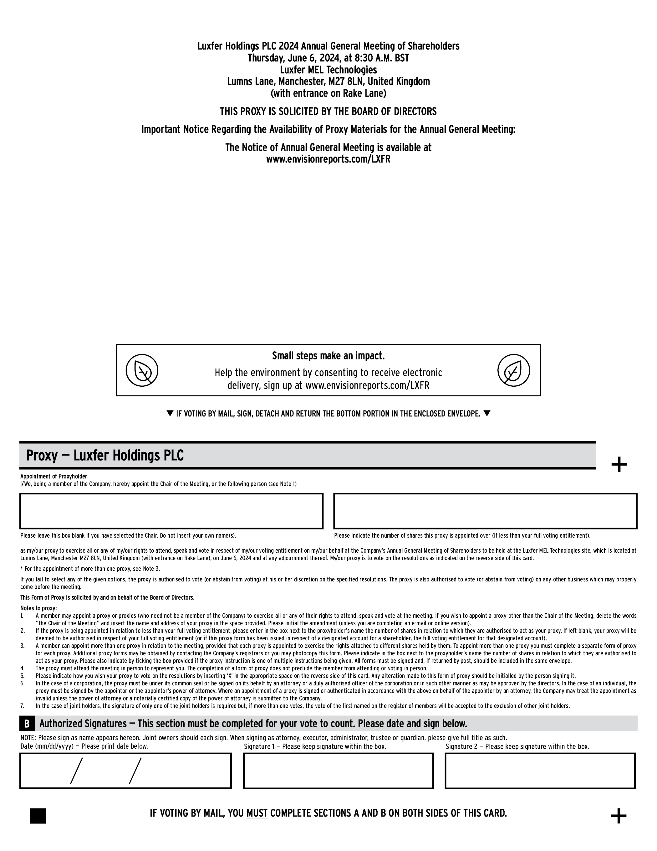 Luxfer Holdings PLC 2024 Annual General Meeting of Shareholders Thursday, June 6, 2024, at 8:30 A.M. BST Luxfer MEL Technologies Lumns Lane, Manchester, M27 8LN, United Kingdom (with entrance on Rake Lane) THIS PROXY IS SOLICITED BY THE BOARD OF DIRECTORS Important Notice Regarding the Availability of Proxy Materials for the Annual General Meeting: The Notice of Annual General Meeting is available at www.envisionreports.com/LXFR Small steps make an impact. Help the environment by consenting to receive electronic delivery, sign up at www.envisionreports.com/LXFR Proxy — Luxfer Holdings PLC IF VOTING BY MAIL, SIGN, DETACH AND RETURN THE BOTTOM PORTION IN THE ENCLOSED ENVELOPE. Appointment of Proxyholder l/We, being a member of the Company, hereby appoint the Chair of the Meeting, or the following person (see Note 1) Please leave this box blank if you have selected the Chair. Do not insert your own name(s). Please indicate the number of shares this proxy is appointed over (if less than your full voting entitlement). as my/our proxy to exercise all or any of my/our rights to attend, speak and vote in respect of my/our voting entitlement on my/our behalf at the Company’s Annual General Meeting of Shareholders to be held at the Luxfer MEL Technologies site, which is located at Lumns Lane, Manchester M27 8LN, United Kingdom (with entrance on Rake Lane), on June 6, 2024 and at any adjournment thereof. My/our proxy is to vote on the resolutions as indicated on the reverse side of this card. * For the appointment of more than one proxy, see Note 3. If you fail to select any of the given options, the proxy is authorised to vote (or abstain from voting) at his or her discretion on the specified resolutions. The proxy is also authorised to vote (or abstain from voting) on any other business which may properly come before the meeting. This Form of Proxy is solicited by and on behalf of the Board of Directors. Notes to proxy: 1. A member may appoint a proxy or proxies (who need not be a member of the Company) to exercise all or any of their rights to attend, speak and vote at the meeting. If you wish to appoint a proxy other than the Chair of the Meeting, delete the words ”the Chair of the Meeting” and insert the name and address of your proxy in the space provided. Please initial the amendment (unless you are completing an e-mail or online version). 2. If the proxy is being appointed in relation to less than your full voting entitlement, please enter in the box next to the proxyholder’s name the number of shares in relation to which they are authorised to act as your proxy. If left blank, your proxy will be deemed to be authorised in respect of your full voting entitlement (or if this proxy form has been issued in respect of a designated account for a shareholder, the full voting entitlement for that designated account). 3. A member can appoint more than one proxy in relation to the meeting, provided that each proxy is appointed to exercise the rights attached to different shares held by them. To appoint more than one proxy you must complete a separate form of proxy for each proxy. Additional proxy forms may be obtained by contacting the Company’s registrars or you may photocopy this form. Please indicate in the box next to the proxyholder’s name the number of shares in relation to which they are authorised to act as your proxy. Please also indicate by ticking the box provided if the proxy instruction is one of multiple instructions being given. All forms must be signed and, if returned by post, should be included in the same envelope. 4. The proxy must attend the meeting in person to represent you. The completion of a form of proxy does not preclude the member from attending or voting in person. 5. Please indicate how you wish your proxy to vote on the resolutions by inserting ‘X’ in the appropriate space on the reverse side of this card. Any alteration made to this form of proxy should be initialled by the person signing it. 6. In the case of a corporation, the proxy must be under its common seal or be signed on its behalf by an attorney or a duly authorised officer of the corporation or in such other manner as may be approved by the directors. In the case of an individual, the proxy must be signed by the appointor or the appointor’s power of attorney. Where an appointment of a proxy is signed or authenticated in accordance with the above on behalf of the appointor by an attorney, the Company may treat the appointment as invalid unless the power of attorney or a notarially certified copy of the power of attorney is submitted to the Company. 7. In the case of joint holders, the signature of only one of the joint holders is required but, if more than one votes, the vote of the first named on the register of members will be accepted to the exclusion of other joint holders. B Authorized Signatures — This section must be completed for your vote to count. Please date and sign below. NOTE: Please sign as name appears hereon. Joint owners should each sign. When signing as attorney, executor, administrator, trustee or guardian, please give full title as such. Date (mm/dd/yyyy) — Please print date below. Signature 1 — Please keep signature within the box. Signature 2 — Please keep signature within the box. IF VOTING BY MAIL, YOU MUST COMPLETE SECTIONS A AND B ON BOTH SIDES OF THIS CARD.