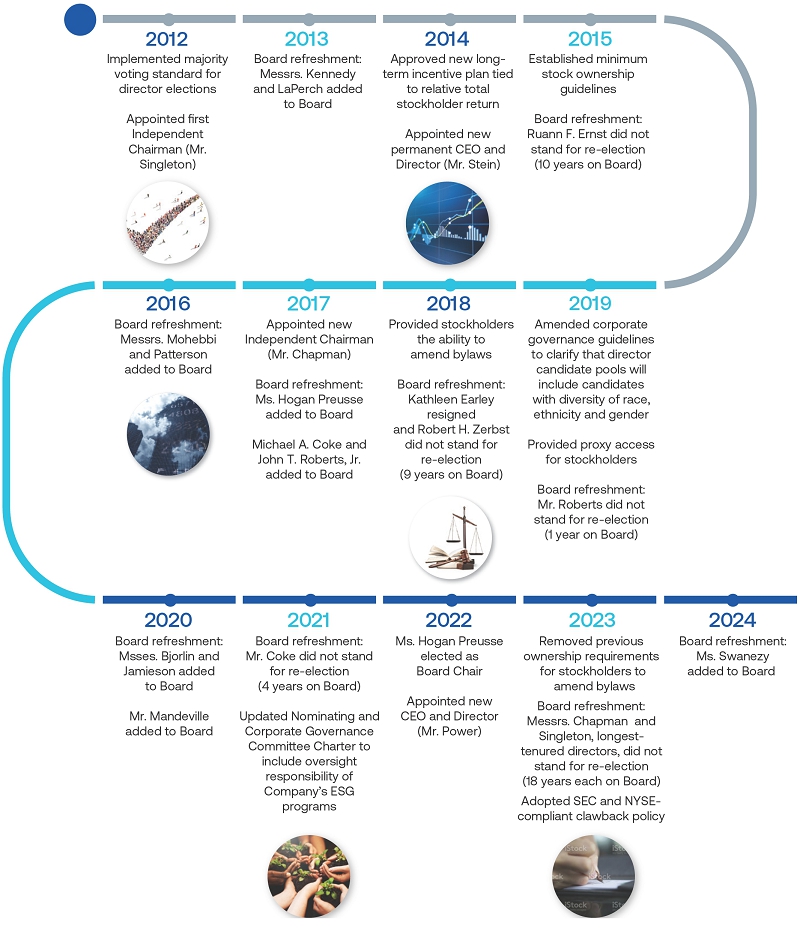 We believe the membership of our Board of Directors (Board) is both balanced and diverse in experience, qualifications, attributes, skills, professional background, areas of expertise and perspectives and that the range of tenures of our directors (shown below) creates a synergy between institutional knowledge and new perspectives.