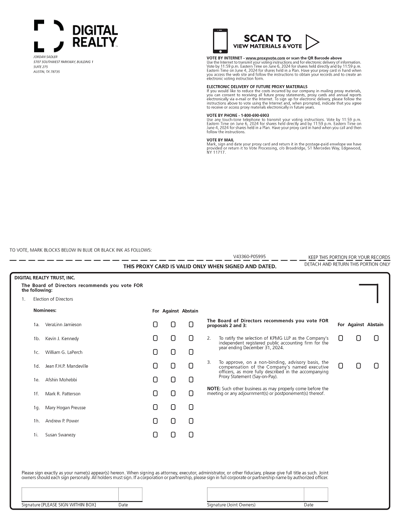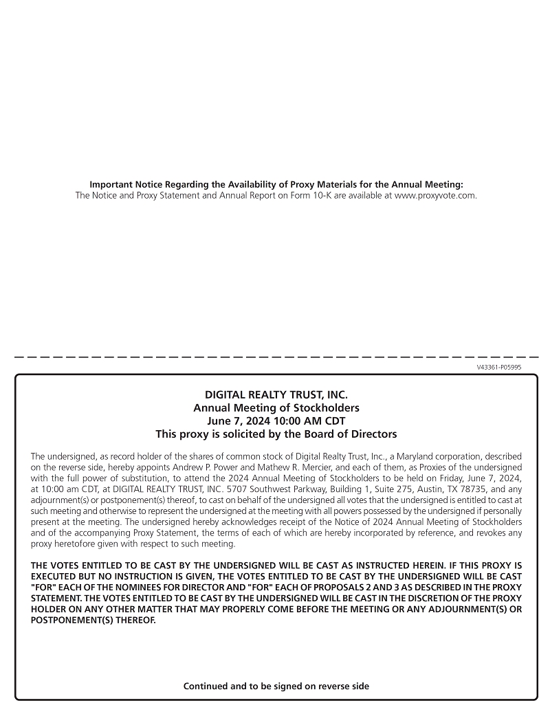 You are cordially invited to attend the 2024 Annual Meeting of Stockholders (the Annual Meeting) of Digital Realty Trust, Inc., a Maryland corporation (the Company), to be held on June 7, 2024, at 10:00 a.m. CDT, at 5707 Southwest Parkway, Building 1, Suite 275, Austin, TX 78735.