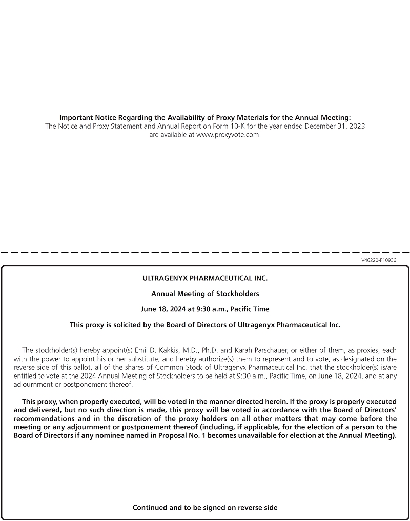 You are cordially invited to attend the Annual Meeting of Stockholders of Ultragenyx Pharmaceutical Inc., a Delaware corporation (we, us, Ultragenyx or the Company), which will be held on June 18, 2024, at 9:30 a.m. Pacific Time virtually via the Internet at www.virtualshareholdermeeting.com/RARE2024 (Annual Meeting). Instructions on how to participate in the Annual Meeting and demonstrate proof of stock ownership are included in this proxy statement (Proxy Statement). The webcast of the Annual Meeting will be archived for one year after the date of the Annual Meeting at www.virtualshareholdermeeting.com/RARE2024. Only stockholders who held stock at the close of business on the record date, April 23, 2024, may vote at the Annual Meeting or any adjournment or postponement thereof.