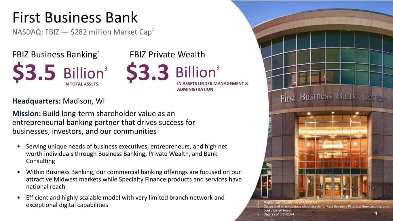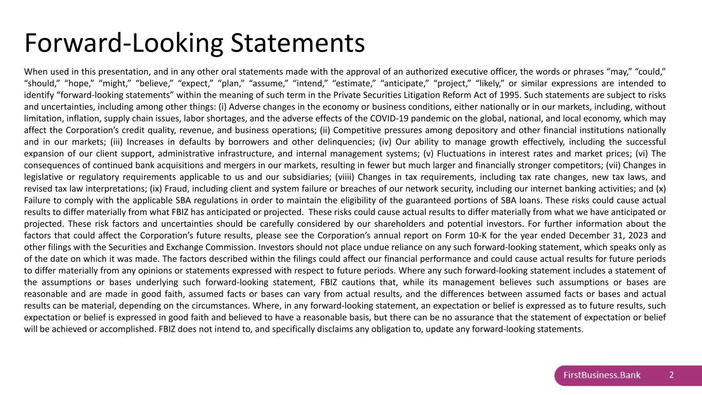 FirstBusiness.Bank2 When used in this presentation, and in any other oral statements made with the approval of an authorized executive officer, the words or phrases “may,” “could,” “should,” “hope,” “might,” “believe,” “expect,” “plan,” “assume,” “intend,” “estimate,” “anticipate,” “project,” “likely,” or similar expressions are intended to identify “forward-looking statements” within the meaning of such term in the Private Securities Litigation Reform Act of 1995. Such statements are subject to risks and uncertainties, including among other things: (i) Adverse changes in the economy or business conditions, either nationally or in our markets, including, without limitation, inflation, supply chain issues, labor shortages, and the adverse effects of the COVID-19 pandemic on the global, national, and local economy, which may affect the Corporation’s credit quality, revenue, and business operations; (ii) Competitive pressures among depository and other financial institutions nationally and in our markets; (iii) Increases in defaults by borrowers and other delinquencies; (iv) Our ability to manage growth effectively, including the successful expansion of our client support, administrative infrastructure, and internal management systems; (v) Fluctuations in interest rates and market prices; (vi) The consequences of continued bank acquisitions and mergers in our markets, resulting in fewer but much larger and financially stronger competitors; (vii) Changes in legislative or regulatory requirements applicable to us and our subsidiaries; (viiii) Changes in tax requirements, including tax rate changes, new tax laws, and revised tax law interpretations; (ix) Fraud, including client and system failure or breaches of our network security, including our internet banking activities; and (x) Failure to comply with the applicable SBA regulations in order to maintain the eligibility of the guaranteed portions of SBA loans. These risks could cause actual results to differ materially from what FBIZ has anticipated or projected. These risks could cause actual results to differ materially from what we have anticipated or projected. These risk factors and uncertainties should be carefully considered by our shareholders and potential investors. For further information about the factors that could affect the Corporation’s future results, please see the Corporation’s annual report on Form 10-K for the year ended December 31, 2023 and other filings with the Securities and Exchange Commission. Investors should not place undue reliance on any such forward-looking statement, which speaks only as of the date on which it was made. The factors described within the filings could affect our financial performance and could cause actual results for future periods to differ materially from any opinions or statements expressed with respect to future periods. Where any such forward-looking statement includes a statement of the assumptions or bases underlying such forward-looking statement, FBIZ cautions that, while its management believes such assumptions or bases are reasonable and are made in good faith, assumed facts or bases can vary from actual results, and the differences between assumed facts or bases and actual results can be material, depending on the circumstances. Where, in any forward-looking statement, an expectation or belief is expressed as to future results, such expectation or belief is expressed in good faith and believed to have a reasonable basis, but there can be no assurance that the statement of expectation or belief will be achieved or accomplished. FBIZ does not intend to, and specifically disclaims any obligation to, update any forward-looking statements. Forward-Looking Statements