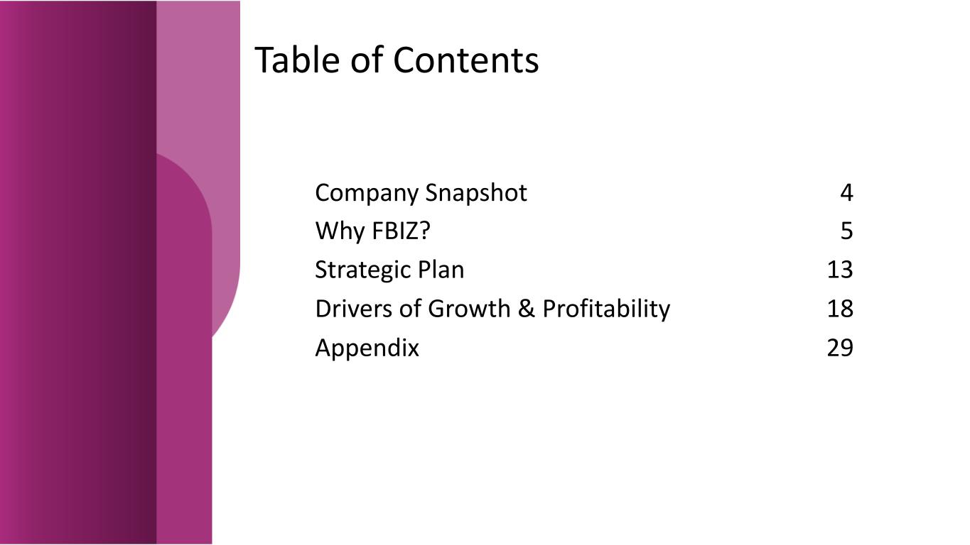 FirstBusiness.Bank Table of Contents Company Snapshot 4 Why FBIZ? 5 Strategic Plan 13 Drivers of Growth & Profitability 18 Appendix 29
