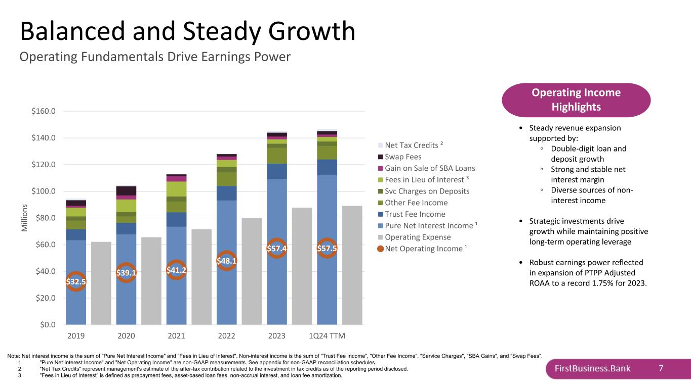 FirstBusiness.Bank6 Growing Profitability FBIZ’s Historic and Ongoing Growth Supports Earnings Power Differentiated Loan Growth Capabilities History of consistent double- digit growth Growth is C&I focused and diversified Strong & Stable Deposit Franchise Track record of double-digit growth driven by deep client relationships Creates relatively stable NIM in a challenging environment (3.58% MRQ) Growing Profitability Profile Consistent long-term positive operating leverage Consistent double digit TBV growth Record PTPP ROAA of 1.75% for 2023 12% 5-year Loan CAGR 2018-2023 15% 5-year Core Deposit CAGR 2018-2023 11% 5-year TBV/Share CAGR 2018-2023