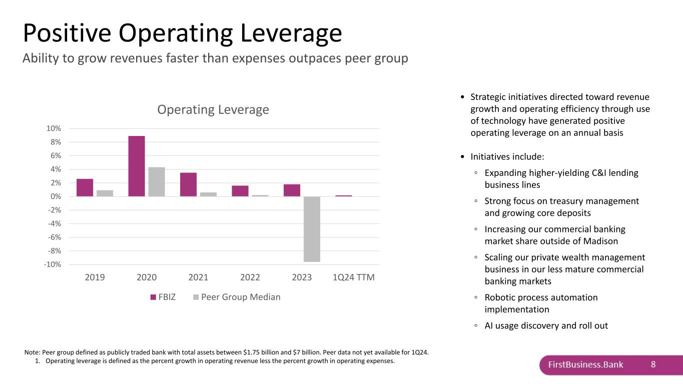 FirstBusiness.Bank7 Balanced and Steady Growth Operating Fundamentals Drive Earnings Power Note: Net interest income is the sum of "Pure Net Interest Income" and "Fees in Lieu of Interest". Non-interest income is the sum of "Trust Fee Income", "Other Fee Income", "Service Charges", "SBA Gains", and "Swap Fees". 1. "Pure Net Interest Income" and "Net Operating Income" are non-GAAP measurements. See appendix for non-GAAP reconciliation schedules. 2. "Net Tax Credits" represent management's estimate of the after-tax contribution related to the investment in tax credits as of the reporting period disclosed. 3. "Fees in Lieu of Interest" is defined as prepayment fees, asset-based loan fees, non-accrual interest, and loan fee amortization. • Steady revenue expansion supported by: ◦ Double-digit loan and deposit growth ◦ Strong and stable net interest margin ◦ Diverse sources of non- interest income • Strategic investments drive growth while maintaining positive long-term operating leverage • Robust earnings power reflected in expansion of PTPP Adjusted ROAA to a record 1.75% for 2023. Operating Income Highlights $32.5 $39.1 $41.2 $48.1 $57.4 $57.5 $0.0 $20.0 $40.0 $60.0 $80.0 $100.0 $120.0 $140.0 $160.0 2019 2020 2021 2022 2023 1Q24 TTM M ill io ns Net Tax Credits ² Swap Fees Gain on Sale of SBA Loans Fees in Lieu of Interest ³ Svc Charges on Deposits Other Fee Income Trust Fee Income Pure Net Interest Income ¹ Operating Expense Net Operating Income ¹