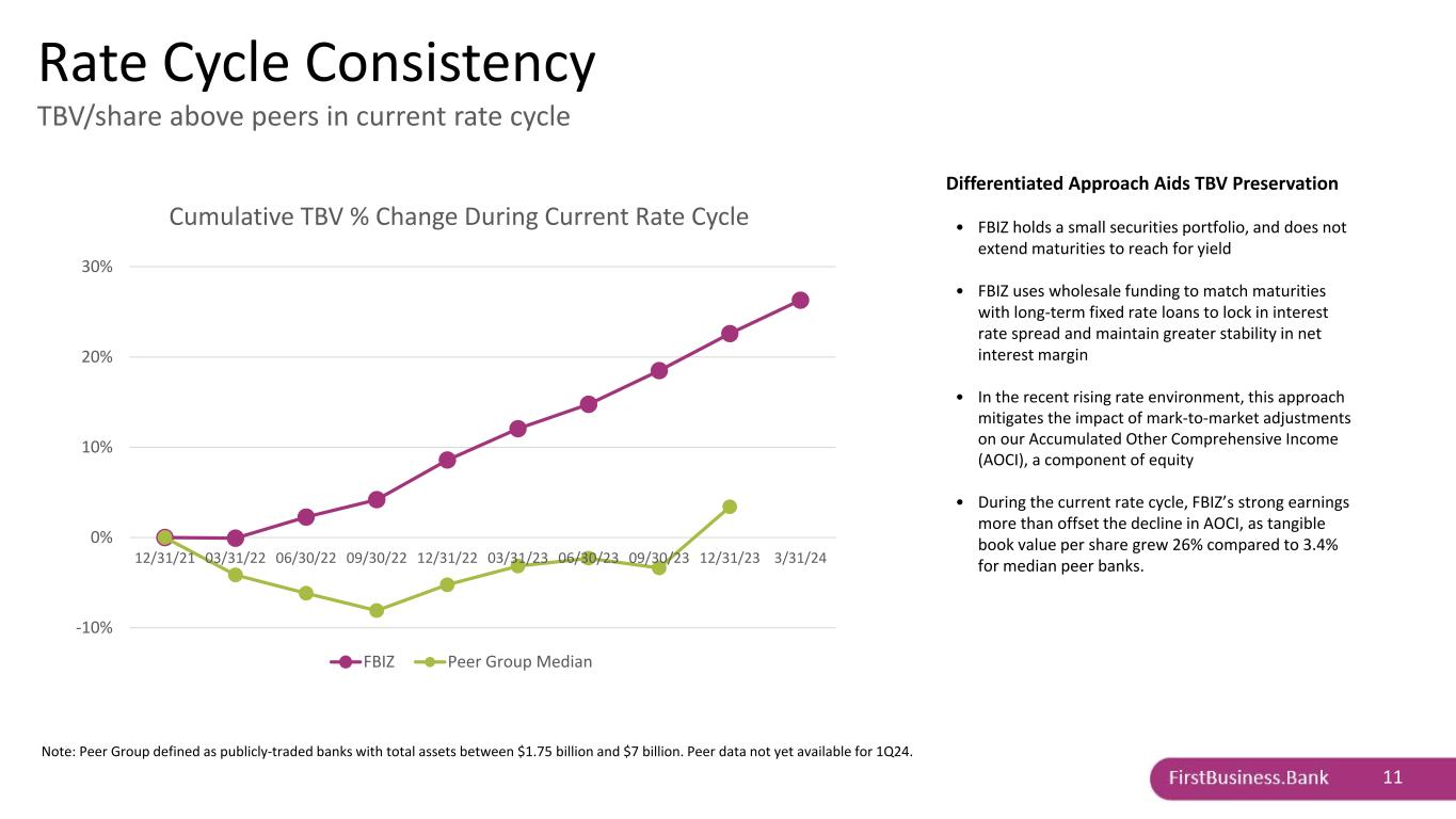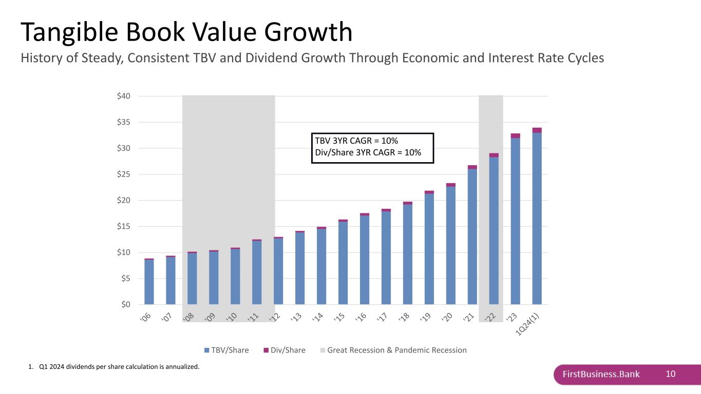 FirstBusiness.Bank10 $0 $5 $10 $15 $20 $25 $30 $35 $40 TBV/Share Div/Share Great Recession & Pandemic Recession Tangible Book Value Growth History of Steady, Consistent TBV and Dividend Growth Through Economic and Interest Rate Cycles TBV 3YR CAGR = 10% Div/Share 3YR CAGR = 10% 1. Q1 2024 dividends per share calculation is annualized.