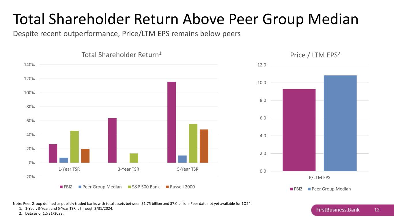 FirstBusiness.Bank11 Rate Cycle Consistency TBV/share above peers in current rate cycle Note: Peer Group defined as publicly-traded banks with total assets between $1.75 billion and $7 billion. Peer data not yet available for 1Q24. Differentiated Approach Aids TBV Preservation • FBIZ holds a small securities portfolio, and does not extend maturities to reach for yield • FBIZ uses wholesale funding to match maturities with long-term fixed rate loans to lock in interest rate spread and maintain greater stability in net interest margin • In the recent rising rate environment, this approach mitigates the impact of mark-to-market adjustments on our Accumulated Other Comprehensive Income (AOCI), a component of equity • During the current rate cycle, FBIZ’s strong earnings more than offset the decline in AOCI, as tangible book value per share grew 26% compared to 3.4% for median peer banks. -10% 0% 10% 20% 30% 12/31/21 03/31/22 06/30/22 09/30/22 12/31/22 03/31/23 06/30/23 09/30/23 12/31/23 3/31/24 Cumulative TBV % Change During Current Rate Cycle FBIZ Peer Group Median