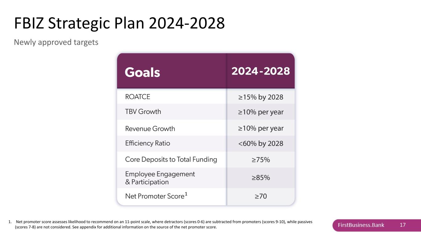 FirstBusiness.Bank17 FBIZ Strategic Plan 2024-2028 Newly approved targets 1. Net promoter score assesses likelihood to recommend on an 11-point scale, where detractors (scores 0-6) are subtracted from promoters (scores 9-10), while passives (scores 7-8) are not considered. See appendix for additional information on the source of the net promoter score. 1