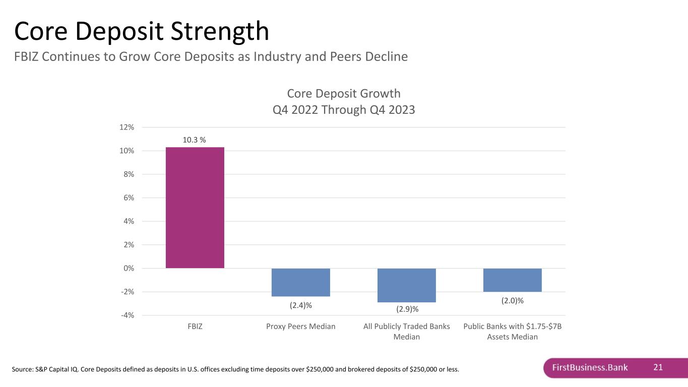 FirstBusiness.Bank20 $1,300 $1,350 $1,400 $1,450 $1,500 $1,550 1Q23 1Q24 th ou sa nd s Gross Treasury Management Service Charges $1,800 $1,900 $2,000 $2,100 $2,200 $2,300 $2,400 1Q23 1Q24 m ill io ns Average Core Deposits Relationship Banking Key to Success Solid Core Deposit Growth Despite Banking Industry Trends • Long-term client relationships drive core deposit growth, aided by clients’ comfort with utilizing the Bank’s longstanding extended deposit insurance products • Successful execution of client deposit initiatives has attracted new relationships and increased gross treasury management service charges • Long-held top-quartile deposit pricing strategy promotes retention • Net Promoter Score1 of 78 is well above industry benchmark score of 23. 1. Net promoter score assesses likelihood to recommend on an 11-point scale, where detractors (scores 0-6) are subtracted from promoters (scores 9-10), while passives (scores 7-8) are not considered. See appendix for additional information on the source of the net promoter score. Growth over prior year quarter = 17% Growth over prior year quarter = 9%