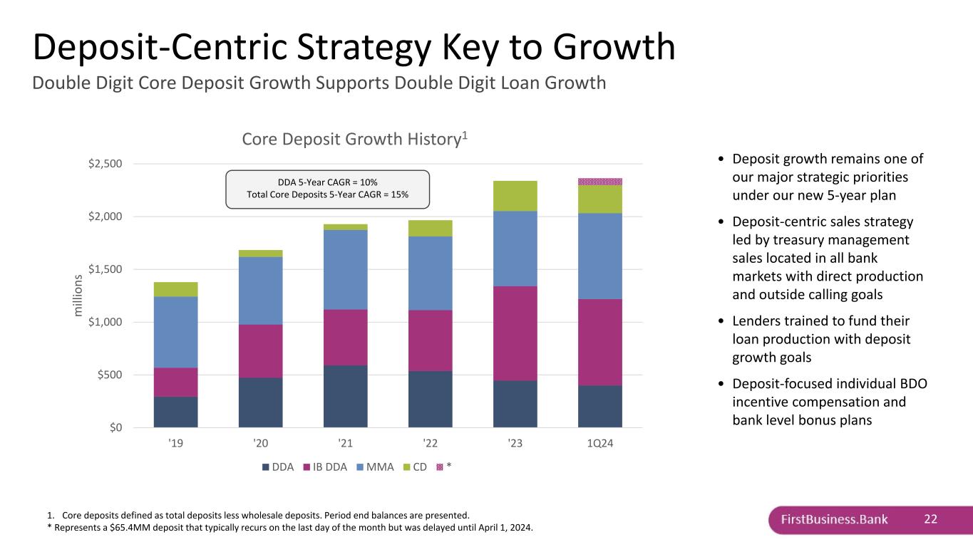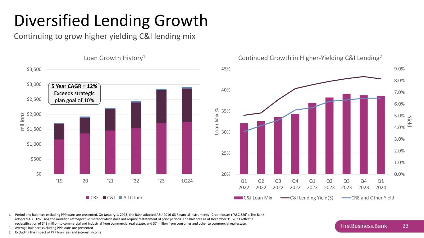FirstBusiness.Bank22 $0 $500 $1,000 $1,500 $2,000 $2,500 '19 '20 '21 '22 '23 1Q24 m ill io ns Core Deposit Growth History1 DDA IB DDA MMA CD * Deposit-Centric Strategy Key to Growth Double Digit Core Deposit Growth Supports Double Digit Loan Growth 1. Core deposits defined as total deposits less wholesale deposits. Period end balances are presented. * Represents a $65.4MM deposit that typically recurs on the last day of the month but was delayed until April 1, 2024. • Deposit growth remains one of our major strategic priorities under our new 5-year plan • Deposit-centric sales strategy led by treasury management sales located in all bank markets with direct production and outside calling goals • Lenders trained to fund their loan production with deposit growth goals • Deposit-focused individual BDO incentive compensation and bank level bonus plans DDA 5-Year CAGR = 10% Total Core Deposits 5-Year CAGR = 15%