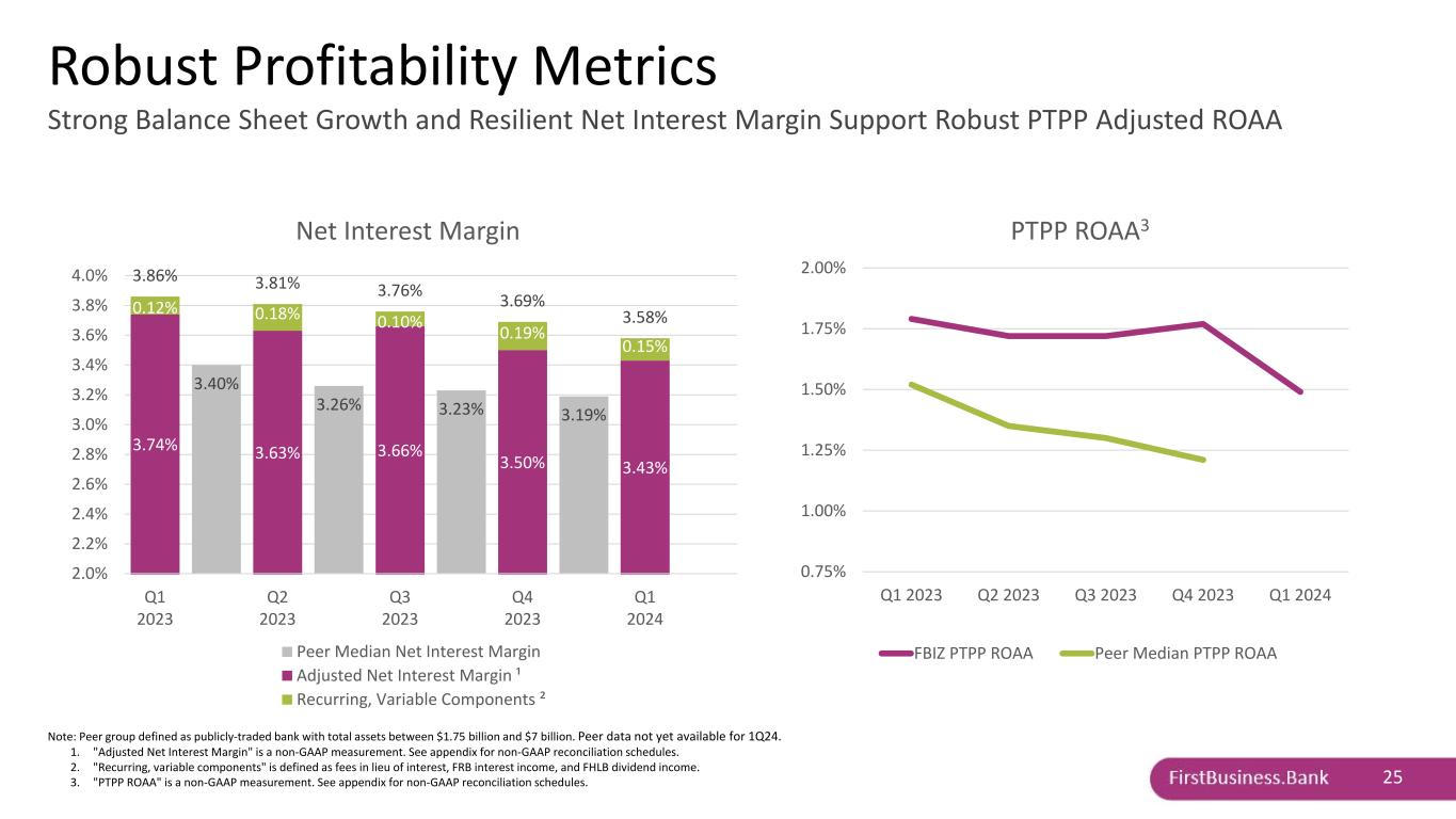 FirstBusiness.Bank24 Margin Strength Through Rate Cycle Match-Funding Strategy Positions Balance Sheet Well for Rate Changes 1. Peer Group defined as publicly-traded banks with total assets between $1.75 billion and $7.0 billion. 2. Board of Governors of the Federal Reserve System (US), Effective Federal Funds Rate [DFF]. Retrieved from FRED, Federal Reserve Bank of St. Louis. Represents average daily rate. 0.0% 1.0% 2.0% 3.0% 4.0% 5.0% 6.0% 2.5% 2.7% 2.9% 3.1% 3.3% 3.5% 3.7% 3.9% 4.1% 4.3% Q1 2022 Q2 2022 Q3 2022 Q4 2022 Q1 2023 Q2 2023 Q3 2023 Q4 2023 Q1 2024 Fed Funds Rate N et In te re st M ar gi n Impact of Increasing Rates FBIZ Net Interest Margin Peer Median Net Interest Margin(1) Average Effective Fed Funds Rate(2) 0% 10% 20% 30% 40% 50% 60% 70% 12/31/21 through 3/31/24 Cumulative Interest Rate Cyle Beta Earning Asset Beta Total Bank Funding Beta