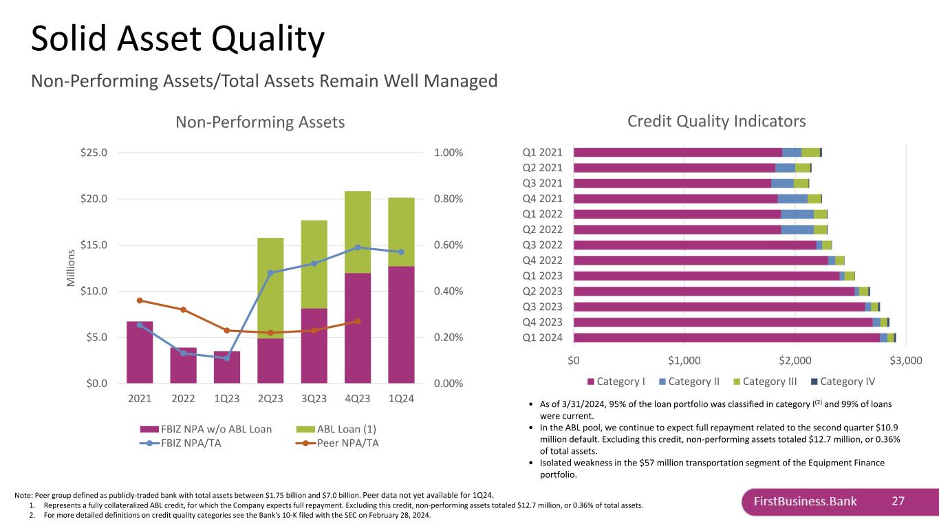 FirstBusiness.Bank27 Solid Asset Quality Non-Performing Assets/Total Assets Remain Well Managed Note: Peer group defined as publicly-traded bank with total assets between $1.75 billion and $7.0 billion. Peer data not yet available for 1Q24. 1. Represents a fully collateralized ABL credit, for which the Company expects full repayment. Excluding this credit, non-performing assets totaled $12.7 million, or 0.36% of total assets. 2. For more detailed definitions on credit quality categories see the Bank's 10-K filed with the SEC on February 28, 2024. • As of 3/31/2024, 95% of the loan portfolio was classified in category I(2) and 99% of loans were current. • In the ABL pool, we continue to expect full repayment related to the second quarter $10.9 million default. Excluding this credit, non-performing assets totaled $12.7 million, or 0.36% of total assets. • Isolated weakness in the $57 million transportation segment of the Equipment Finance portfolio. 0.00% 0.20% 0.40% 0.60% 0.80% 1.00% $0.0 $5.0 $10.0 $15.0 $20.0 $25.0 2021 2022 1Q23 2Q23 3Q23 4Q23 1Q24 M ill io ns Non-Performing Assets FBIZ NPA w/o ABL Loan ABL Loan (1) FBIZ NPA/TA Peer NPA/TA $0 $1,000 $2,000 $3,000 Q1 2024 Q4 2023 Q3 2023 Q2 2023 Q1 2023 Q4 2022 Q3 2022 Q2 2022 Q1 2022 Q4 2021 Q3 2021 Q2 2021 Q1 2021 Credit Quality Indicators Category I Category II Category III Category IV